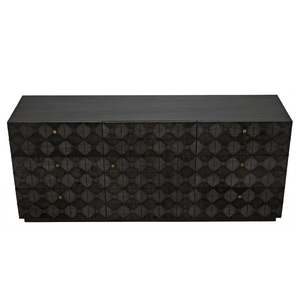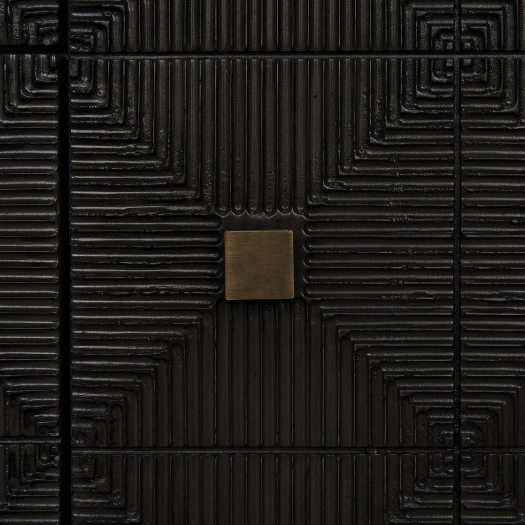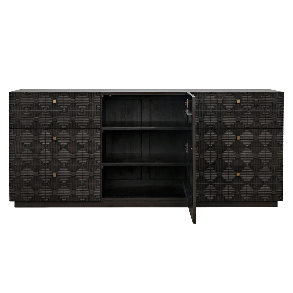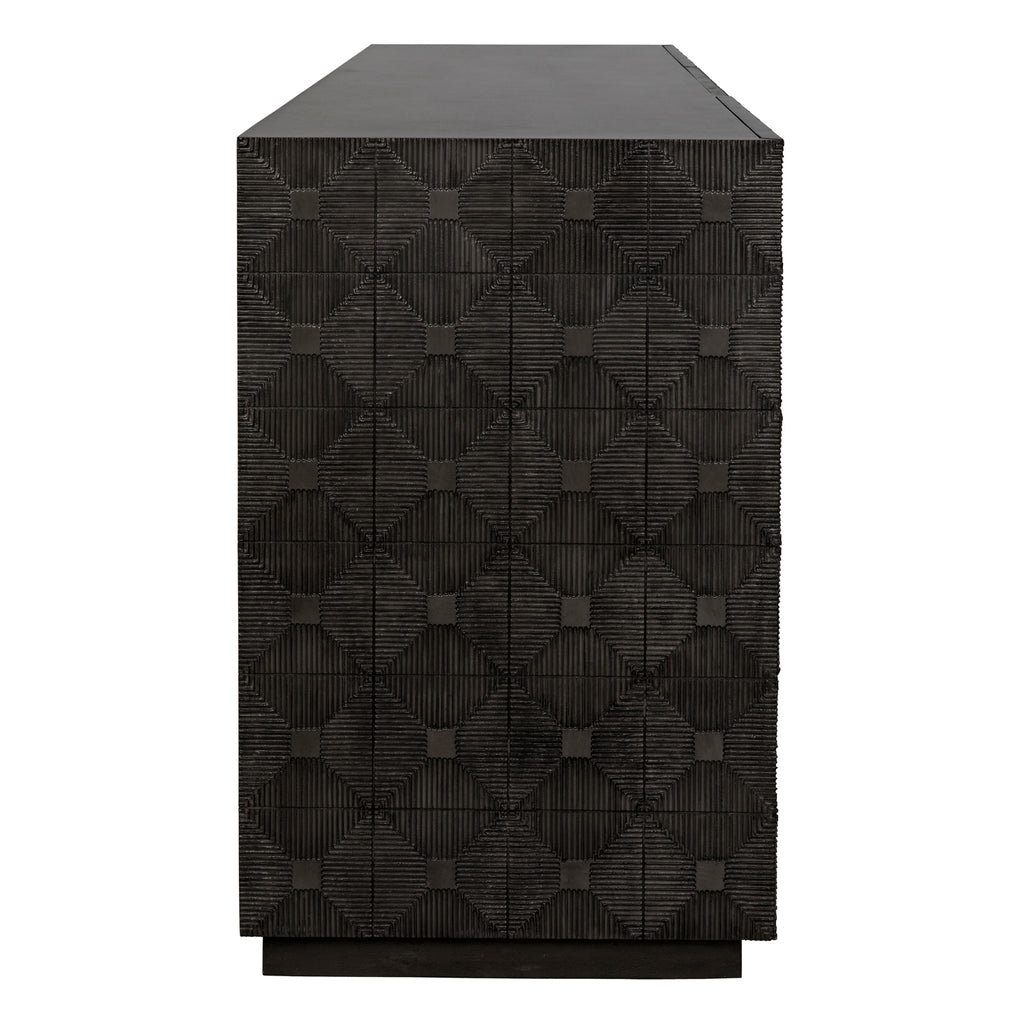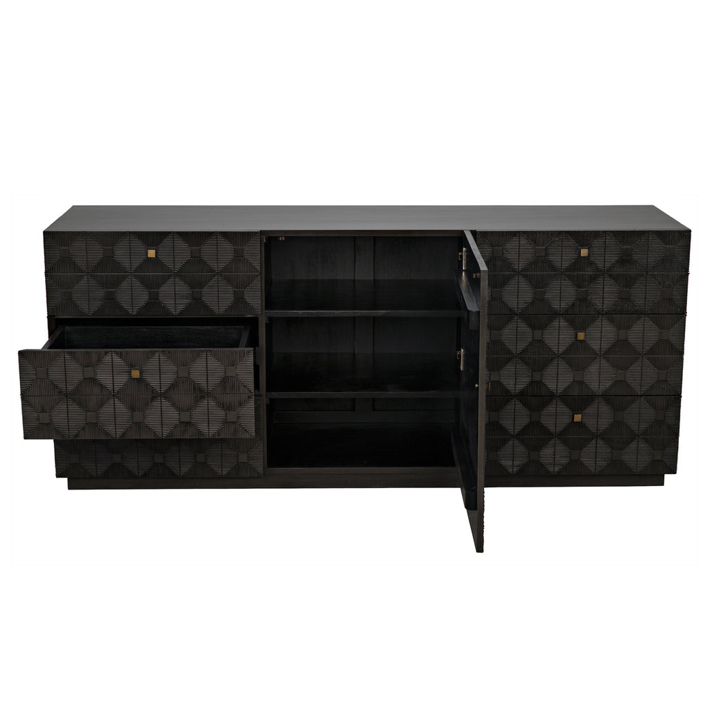 Carved of the most revered hardwood, mahogany, three sides of the Noir Leon dresser are adorned with decorative geometrical patterns. Its central cupboard opens to reveal three shelves, and is itself surrounded by six generous drawers.