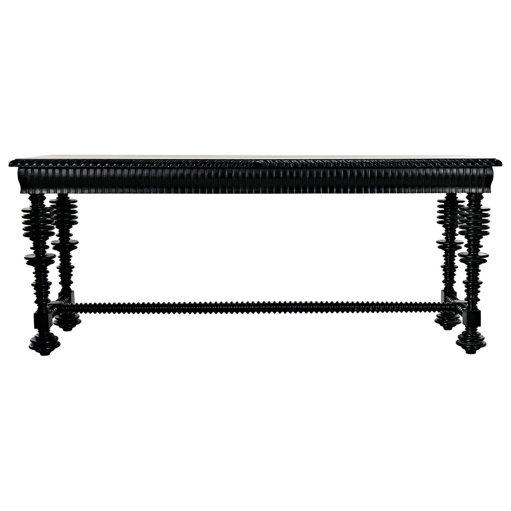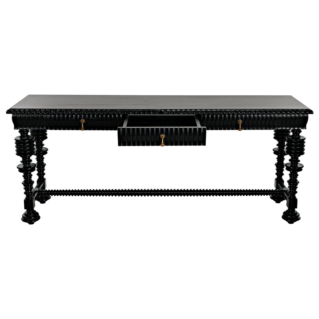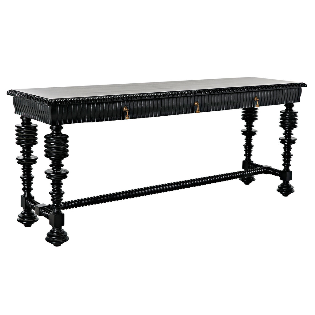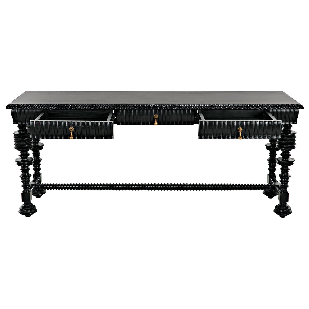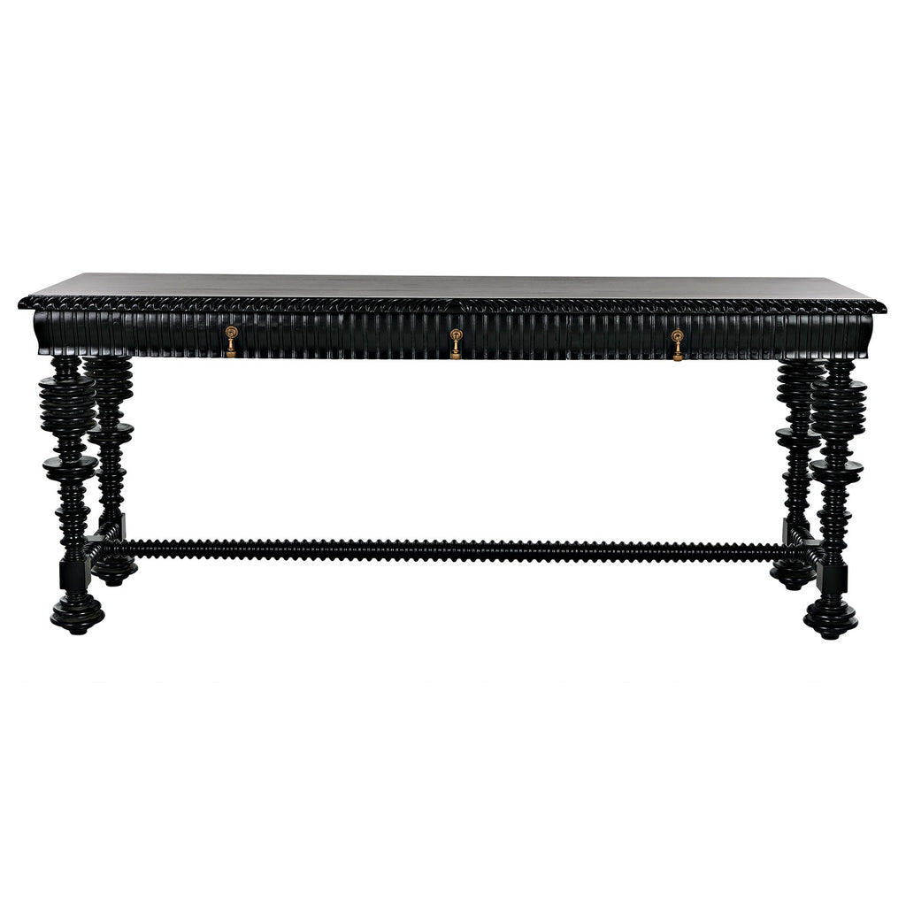 An excellent addition to a foyer or hallway, this Noir console table delights with contemporary flair. Simple yet chic, this functional furnishing adds dimensional depth to any space. The classic Noir Portuguese desk is re-imagined as a 72.5in long console that features intricate and labor intensive, turning and carving on all four sides. Hand rubbed black finish is lustrous and satiny, three drawers are accented by intricate antique brass finish teardrop pulls.