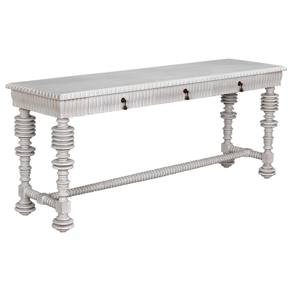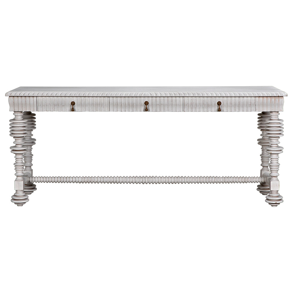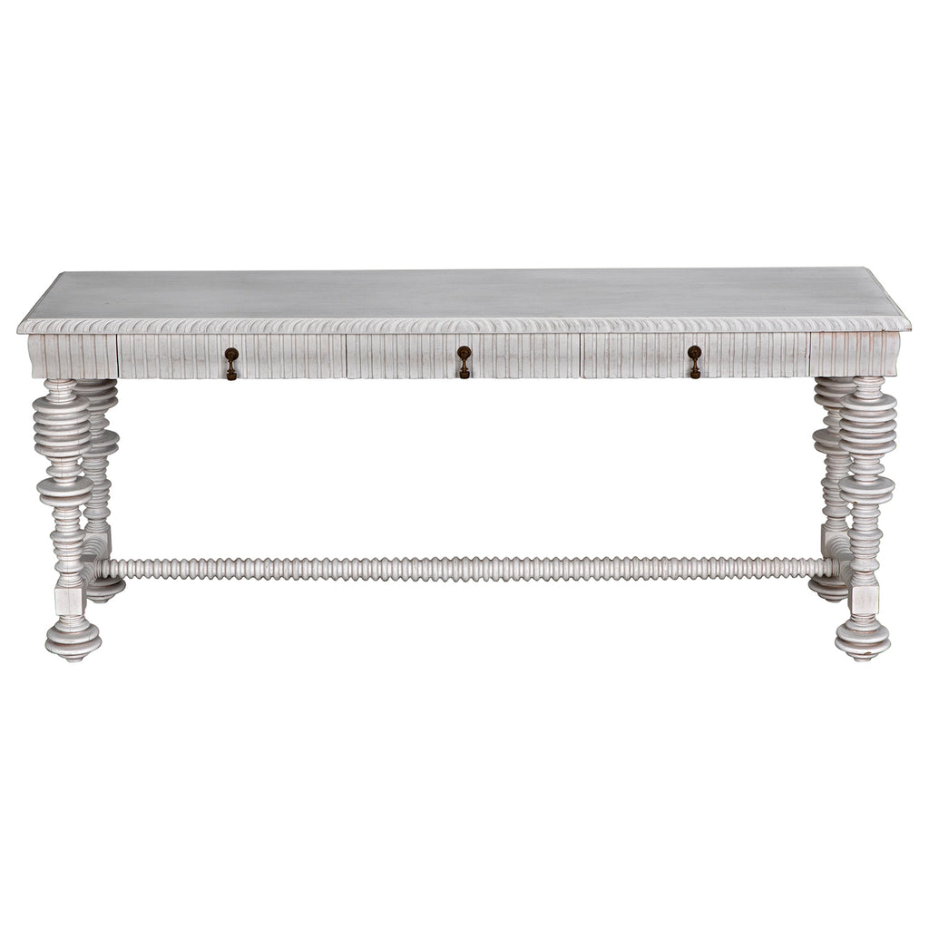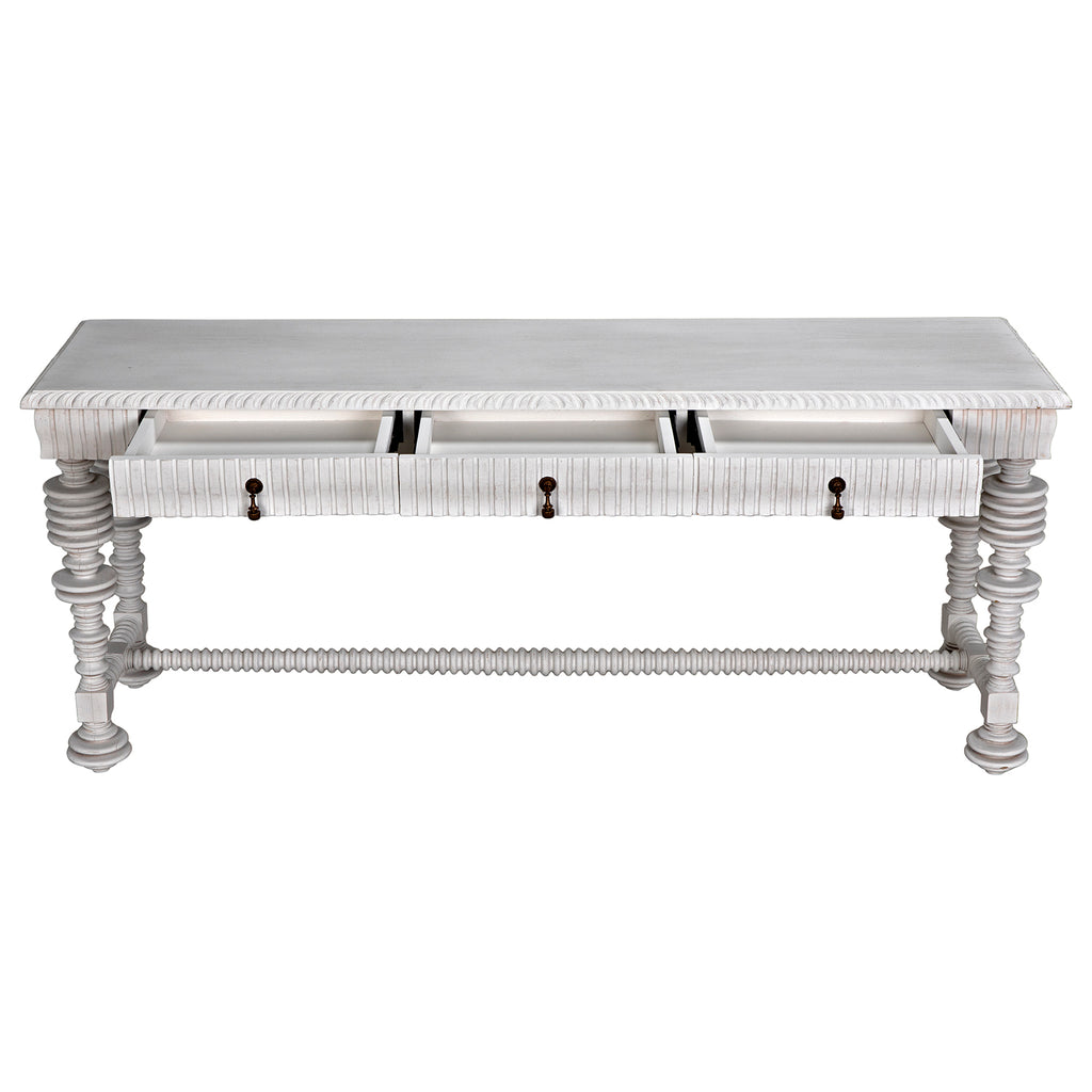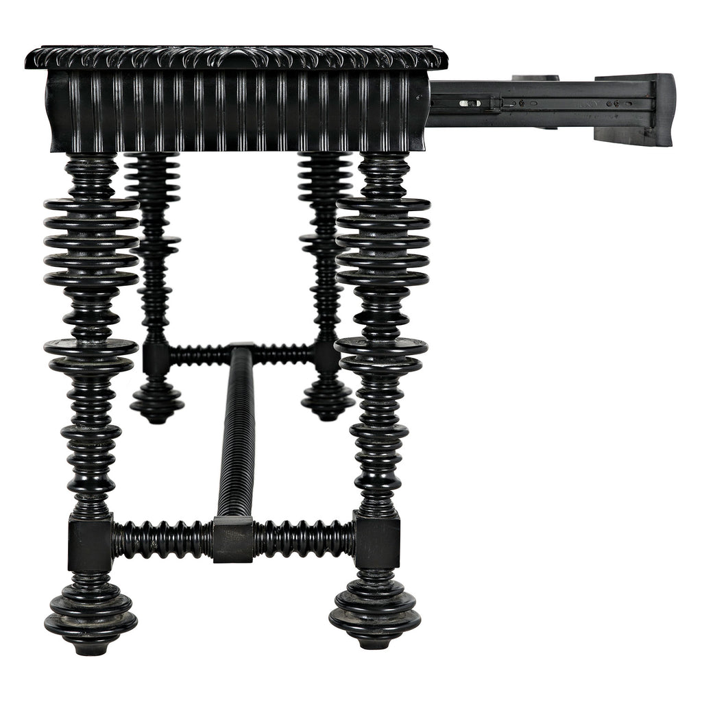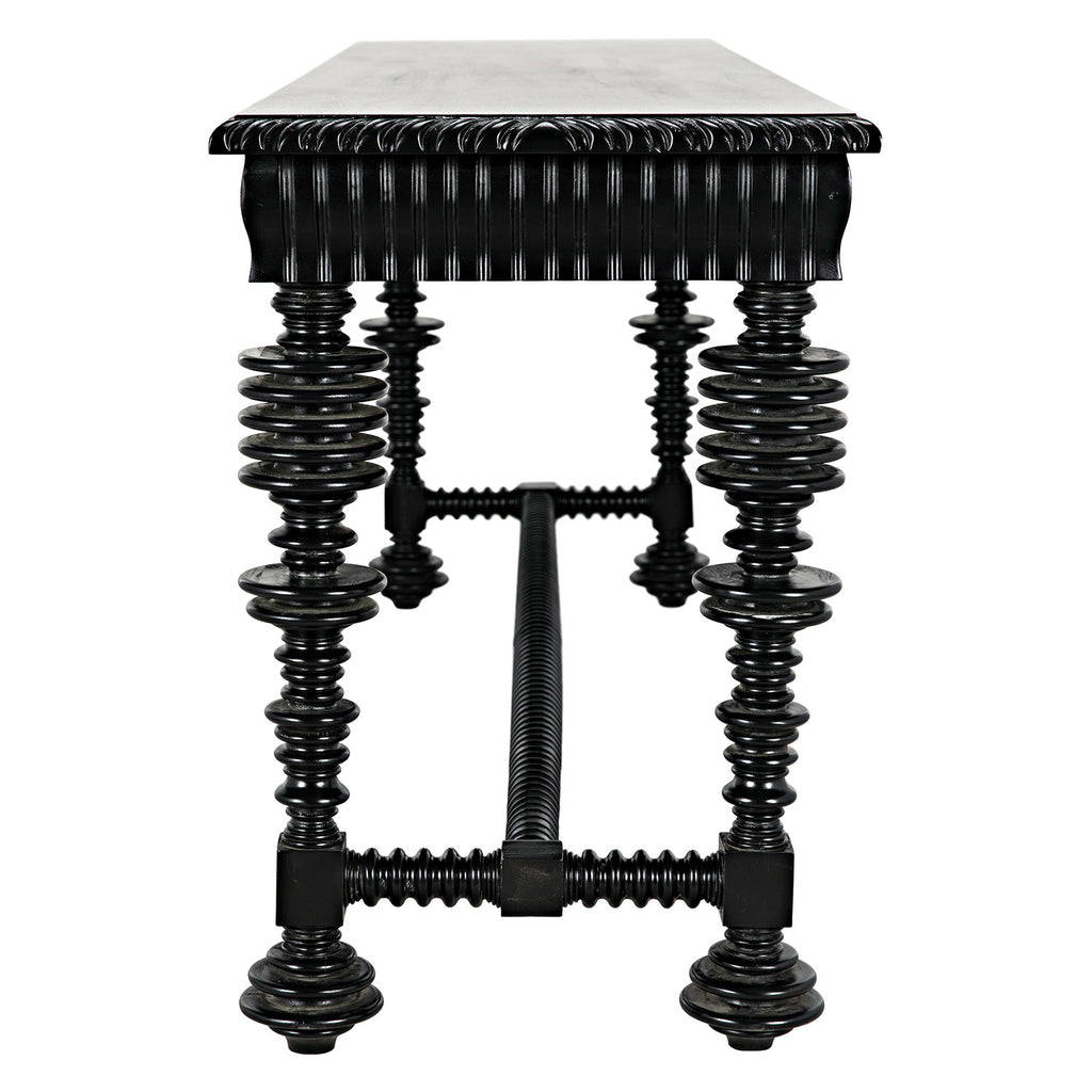 An excellent addition to a foyer or hallway, this Noir console table delights with contemporary flair. Simple yet chic, this functional furnishing adds dimensional depth to any space. The classic Noir Portuguese desk is re-imagined as a 72.5in long console that features intricate and labor intensive, turning and carving on all four sides. Hand rubbed black finish is lustrous and satiny, three drawers are accented by intricate antique brass finish teardrop pulls.