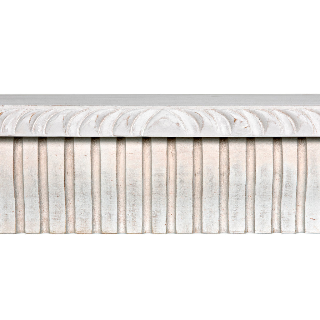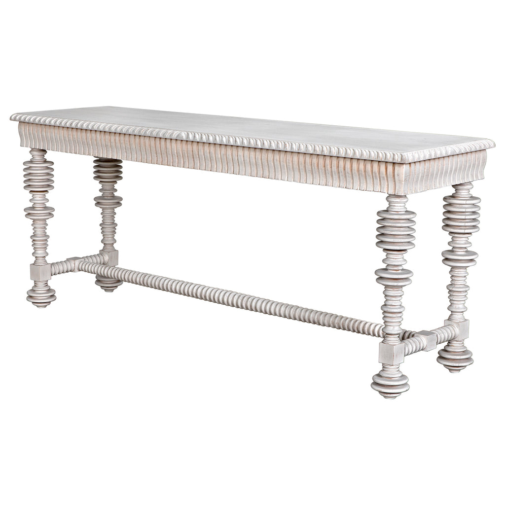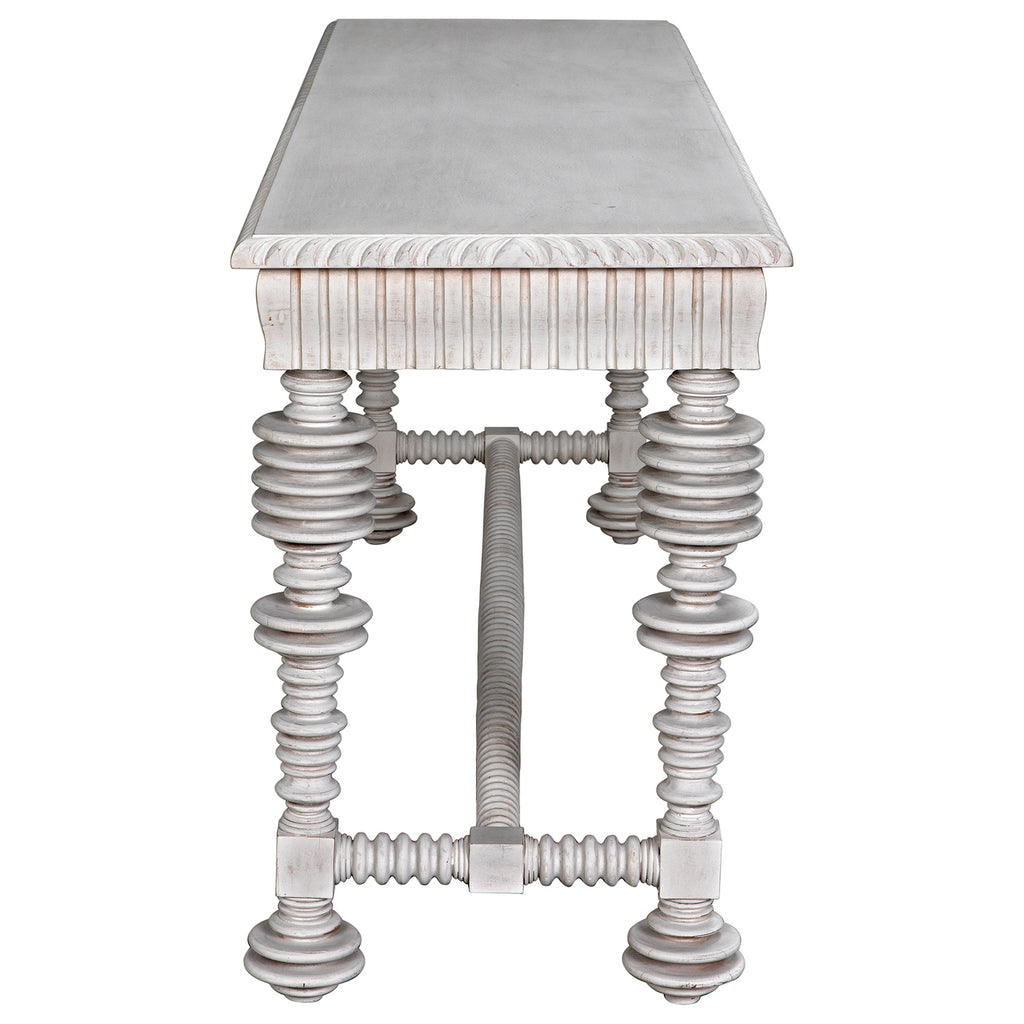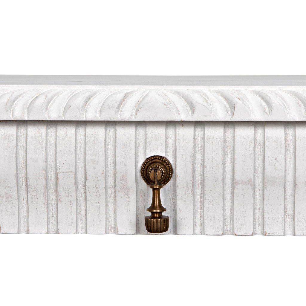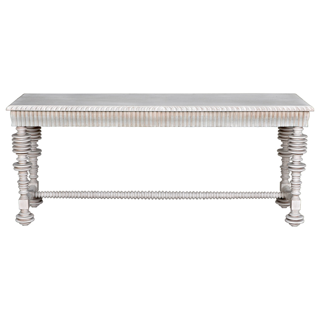 An excellent addition to a foyer or hallway, this Noir console table delights with contemporary flair. Simple yet chic, this functional furnishing adds dimensional depth to any space. The classic Noir Portuguese desk is re-imagined as a 72.5in long console that features intricate and labor intensive, turning and carving on all four sides. Hand rubbed black finish is lustrous and satiny, three drawers are accented by intricate antique brass finish teardrop pulls.