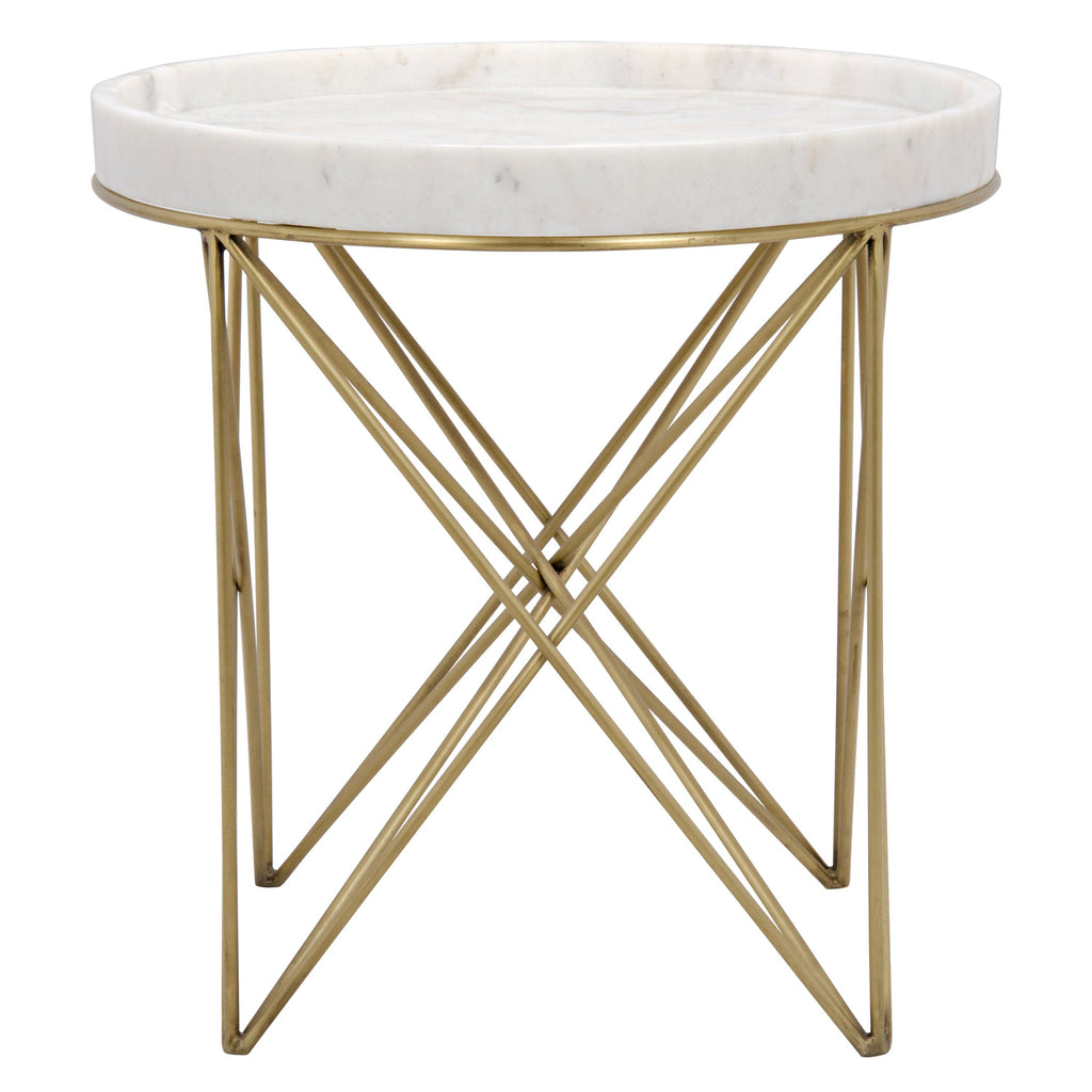 This elegant Noir table accents living rooms and bedrooms with contemporary function. Versatile to match a variety of aesthetics, this furnishing adds style to any space. Slim, seemingly delicate bands of metal gracefully support a marble top in this lovely table. The metal is given a softly burnished brass finish to complement the clean white of the natural stone. No two pieces of stone, and therefore no two tables, will be identical.