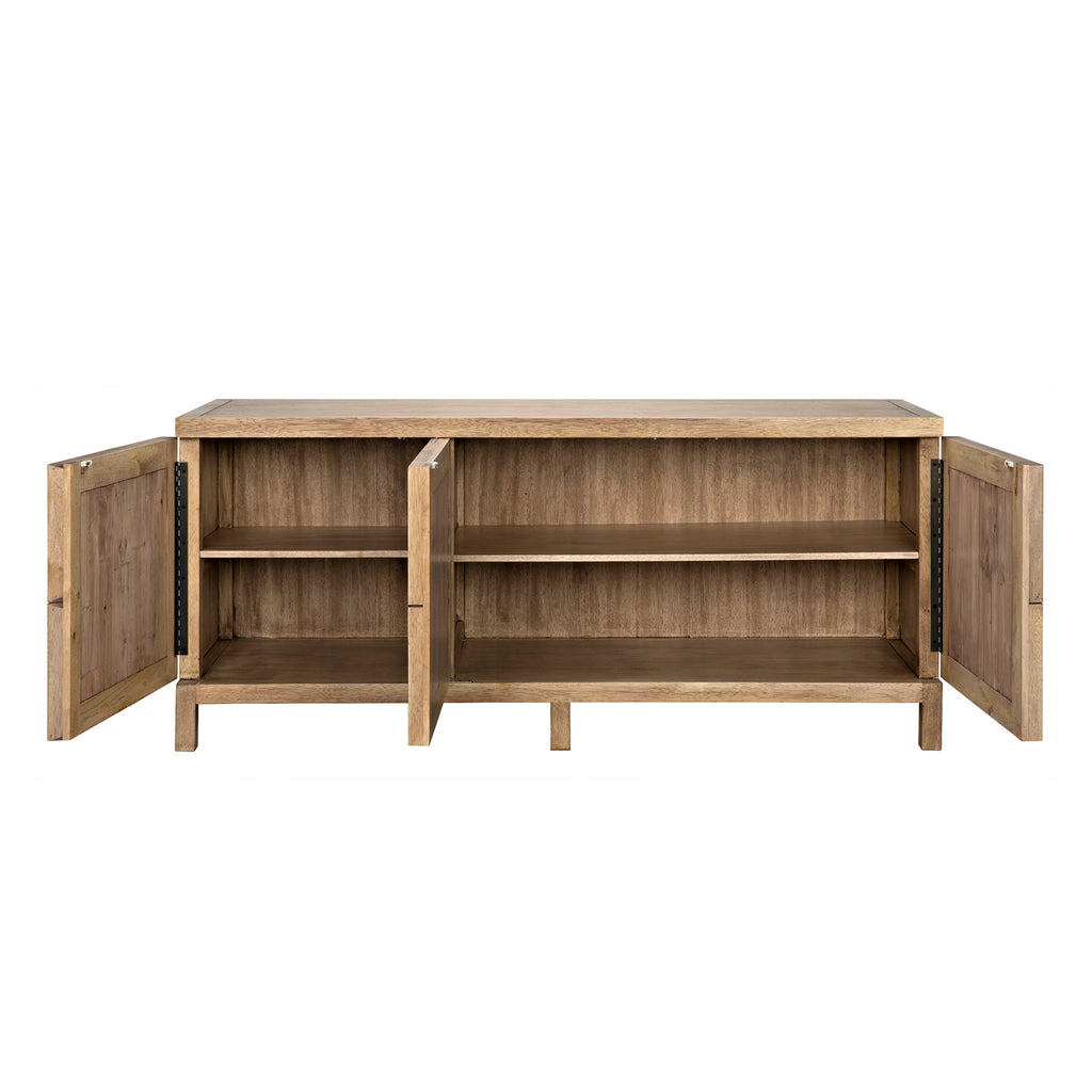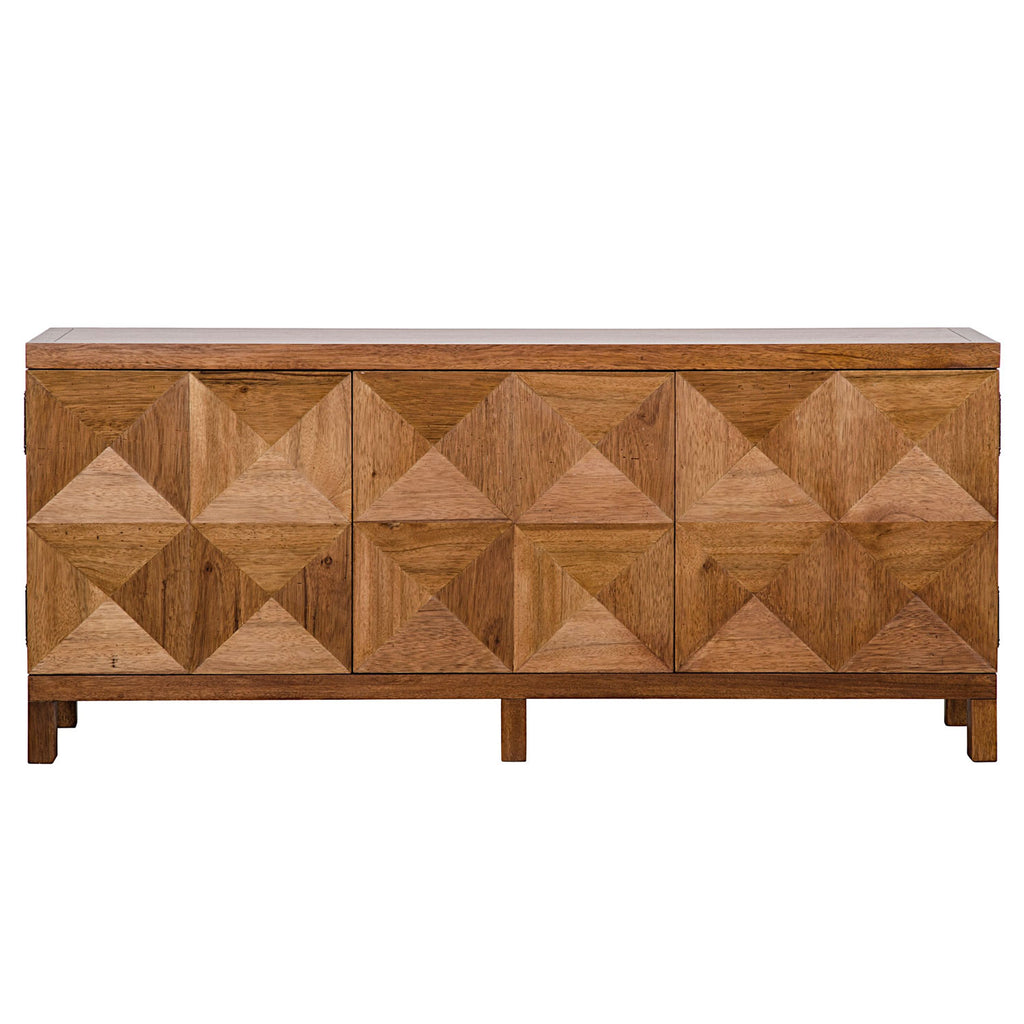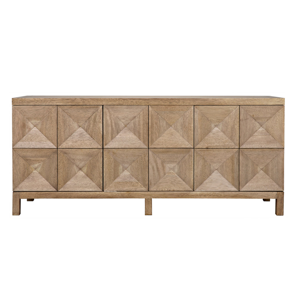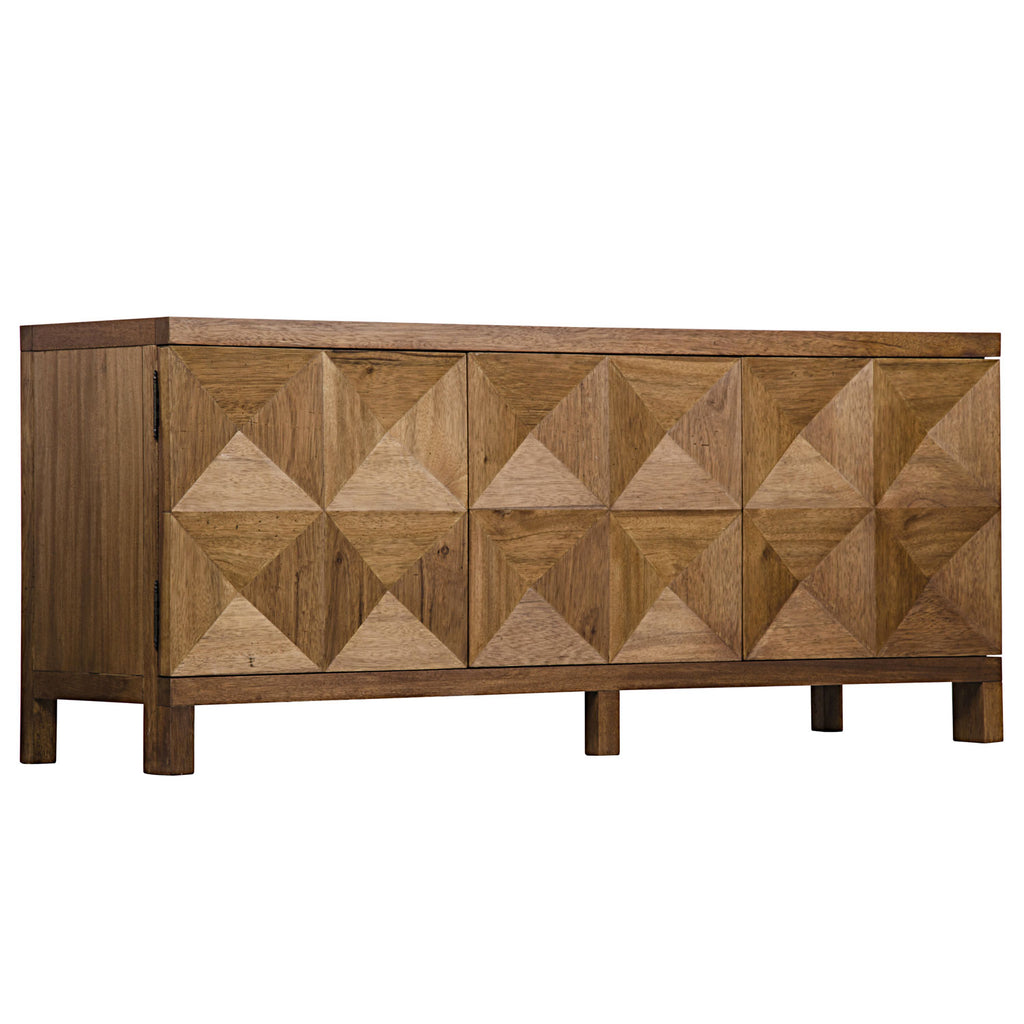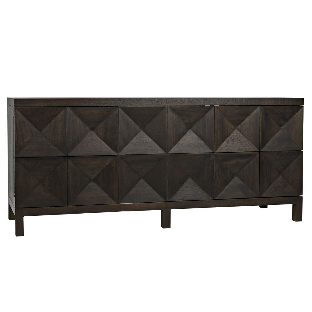 This classic yet contemporary Noir Quadrant 3 door sideboard features three geometrically carved doors that open via hidden push latch to reveal two large interior cupboards. Artisan crafted and finished without sealer, the walnut receives a coat of wax, allowing the table to age naturally over time.
