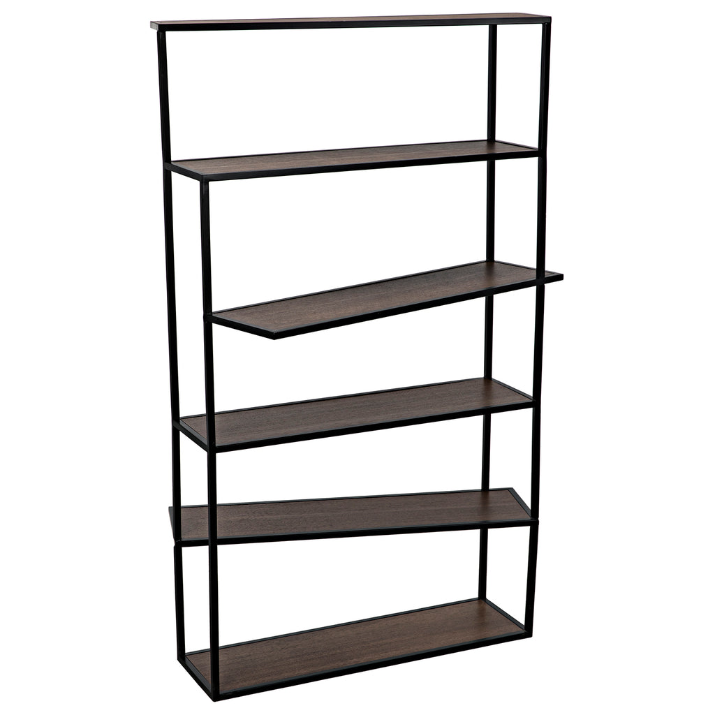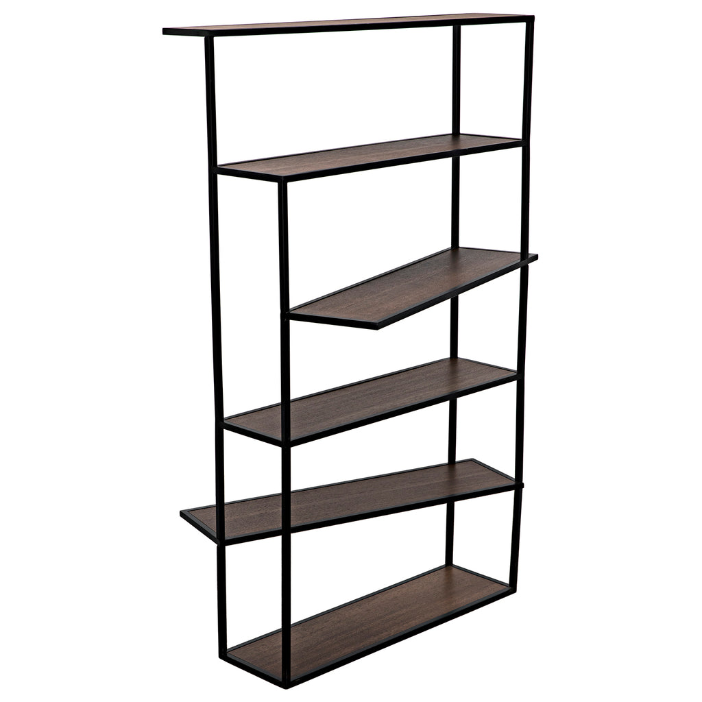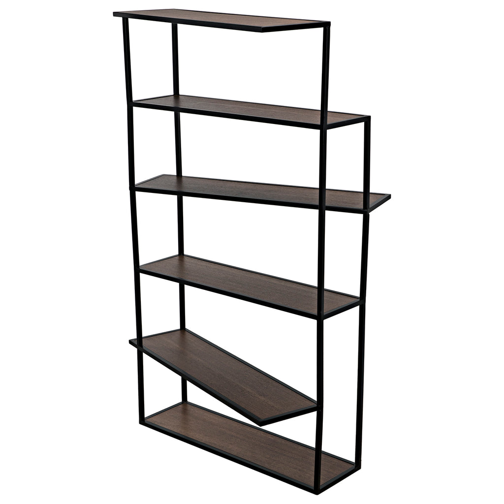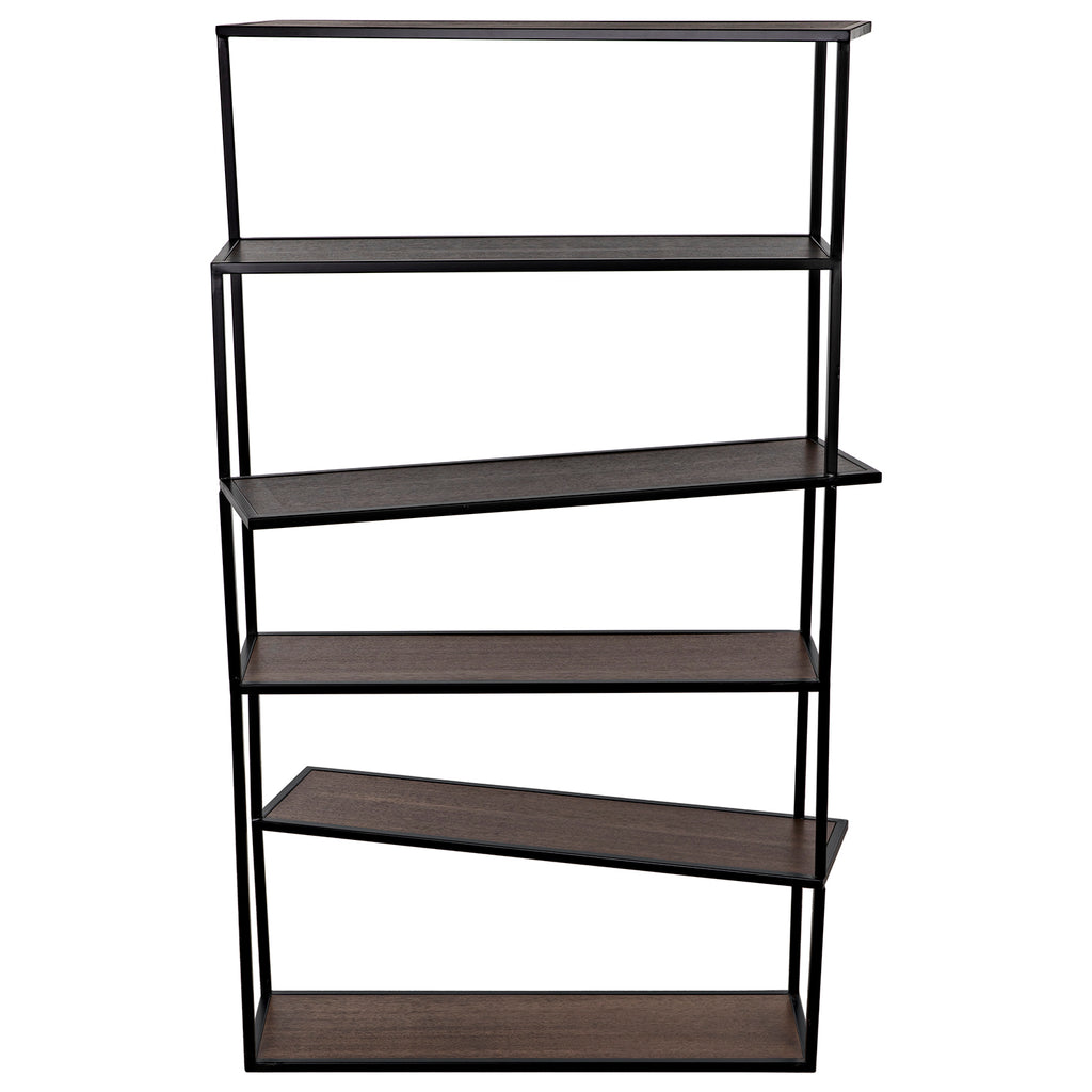 The Verso Bookcase combines an industrial steel frame finished in black with dark walnut veneered shelves seemingly placed randomly, creating a sculptural effect. Perfect as a floating space divider or in linked pairs.