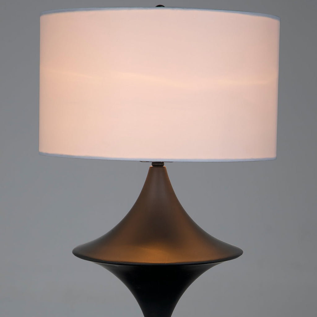 Handmade from Industrial Steel, the Wilder lamp design shows of an elegant mid-century inspired spinning top design for a simple statement. White drum shade.