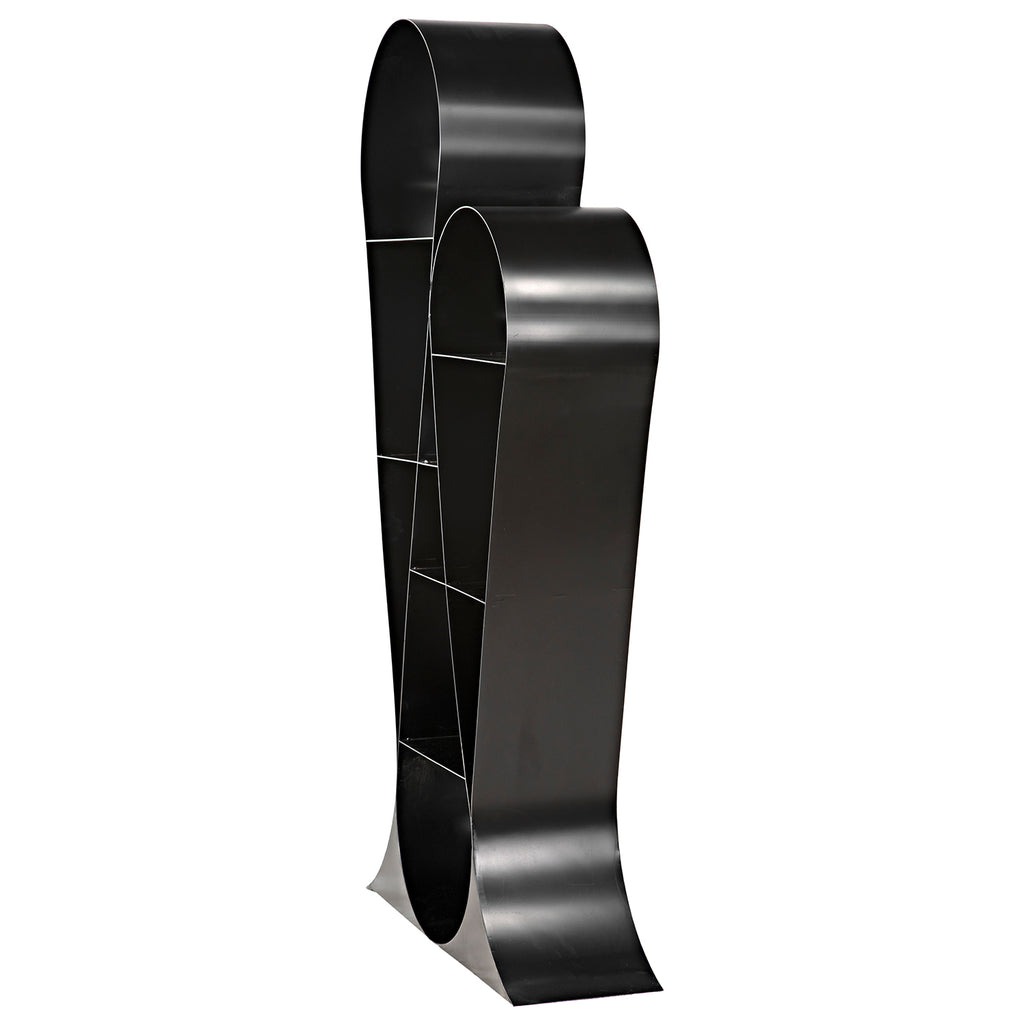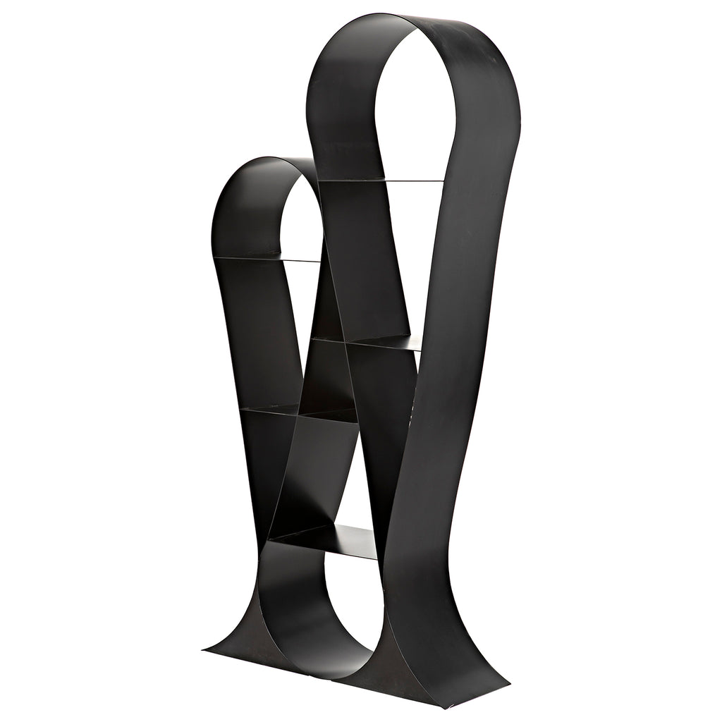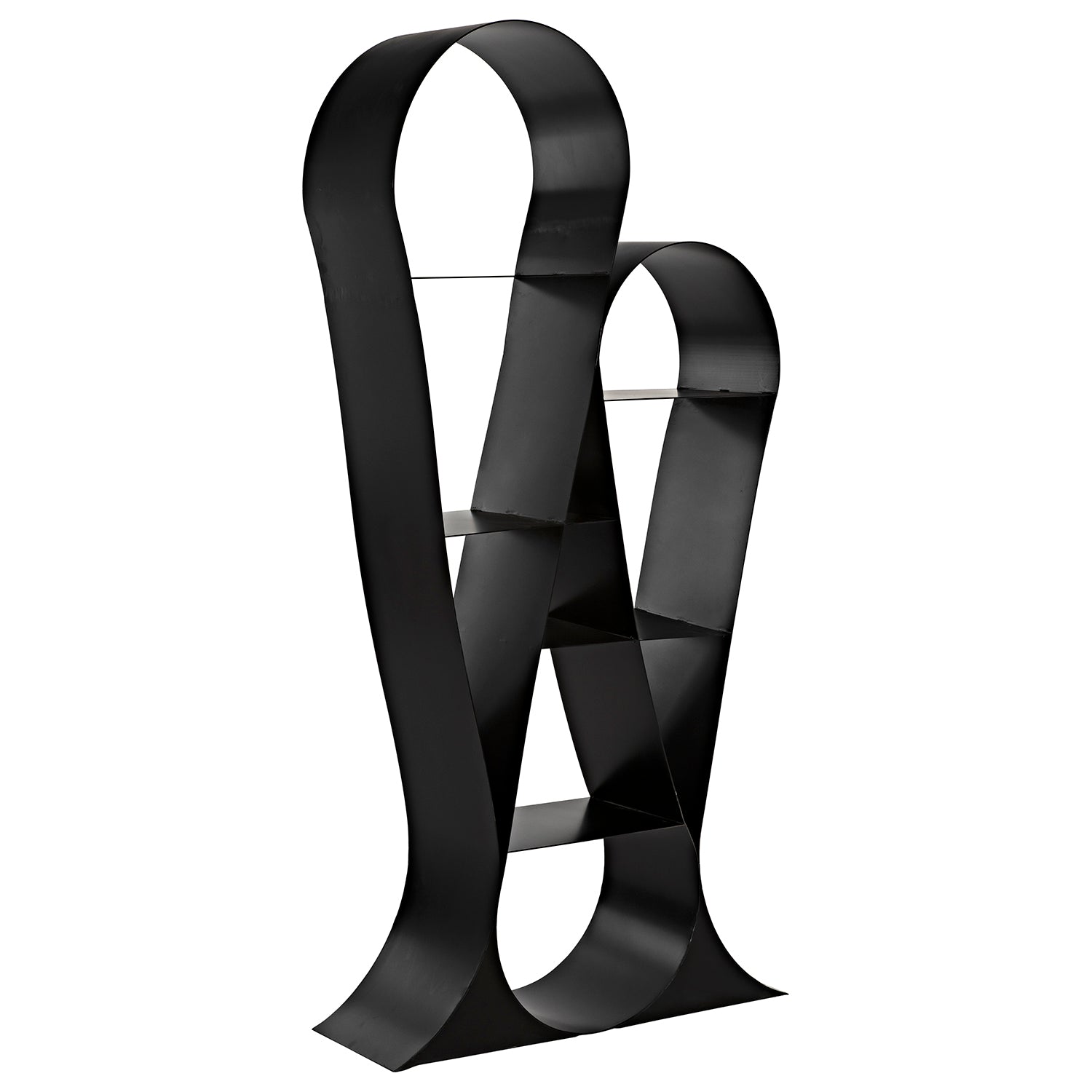 Crafted in matte black finished metal, this statement bookcase suggests massive ribbons or loops in repetition. Its pared down, lyrical lines and industrial inspiration keep the look sleek, sophisticated, and very contemporary.