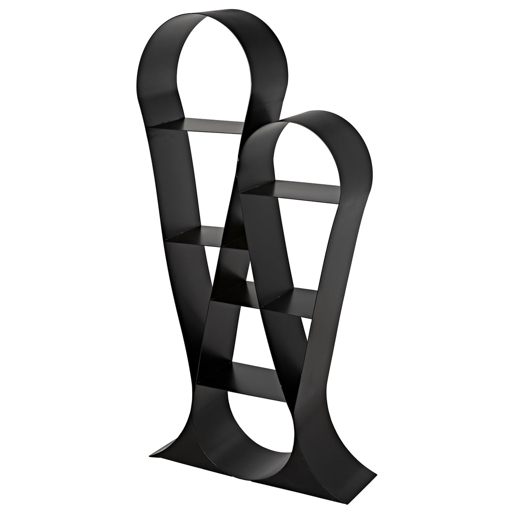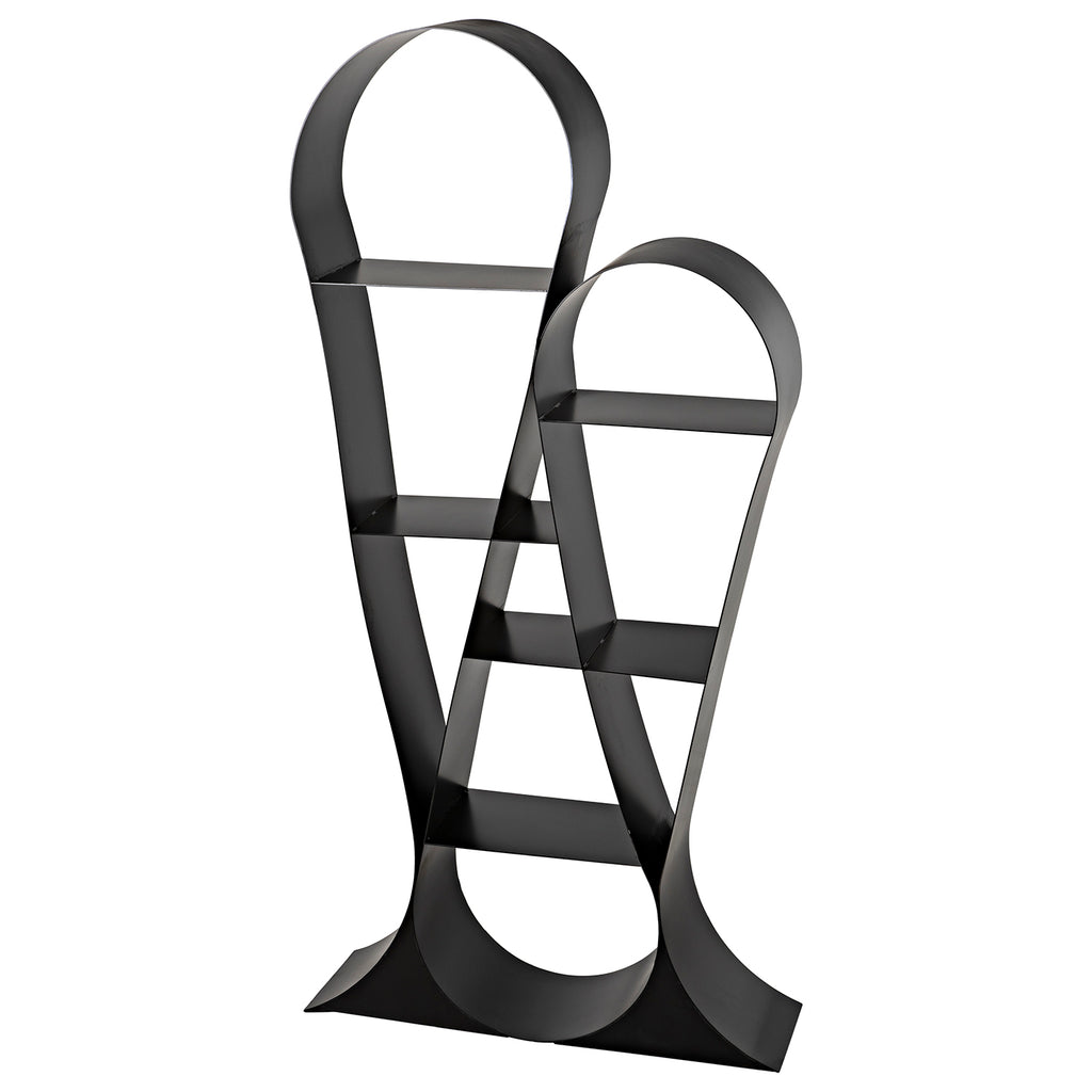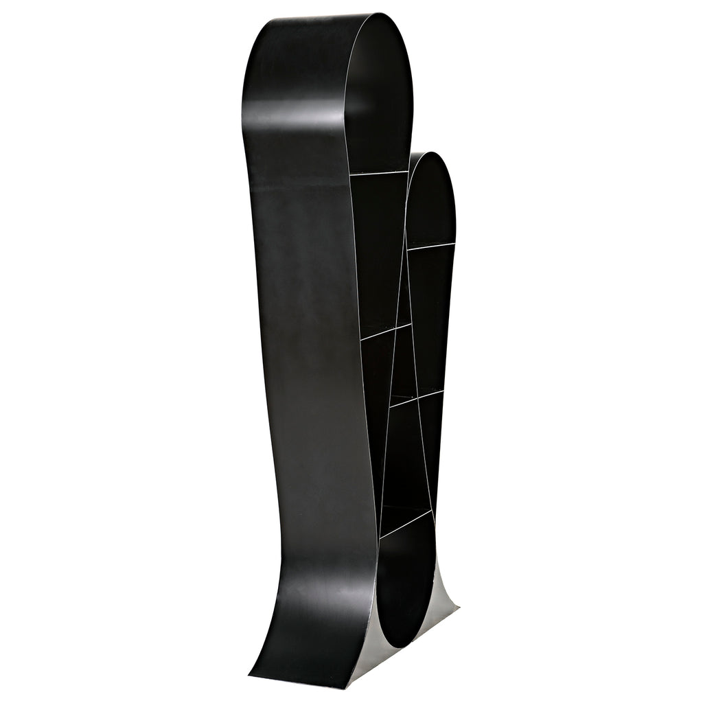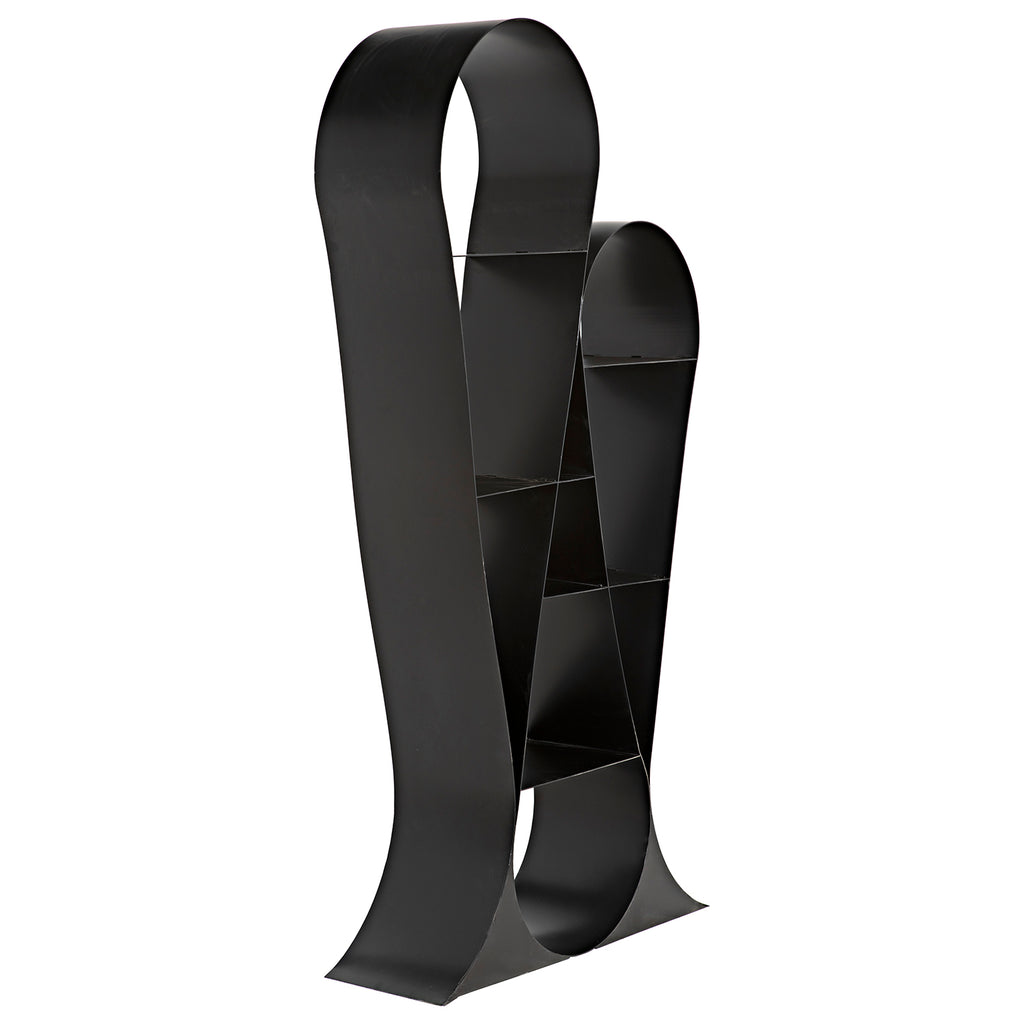Crafted in matte black finished metal, this statement bookcase suggests massive ribbons or loops in repetition. Its pared down, lyrical lines and industrial inspiration keep the look sleek, sophisticated, and very contemporary.