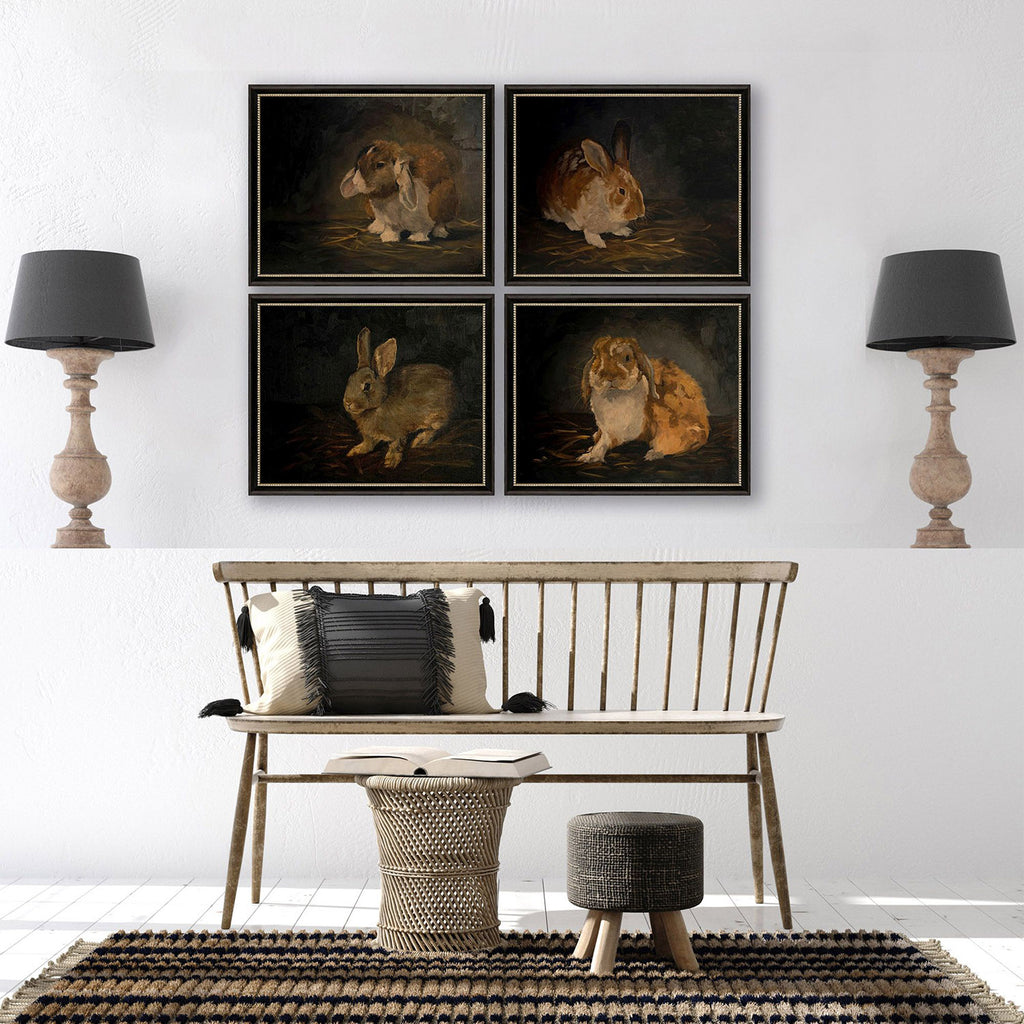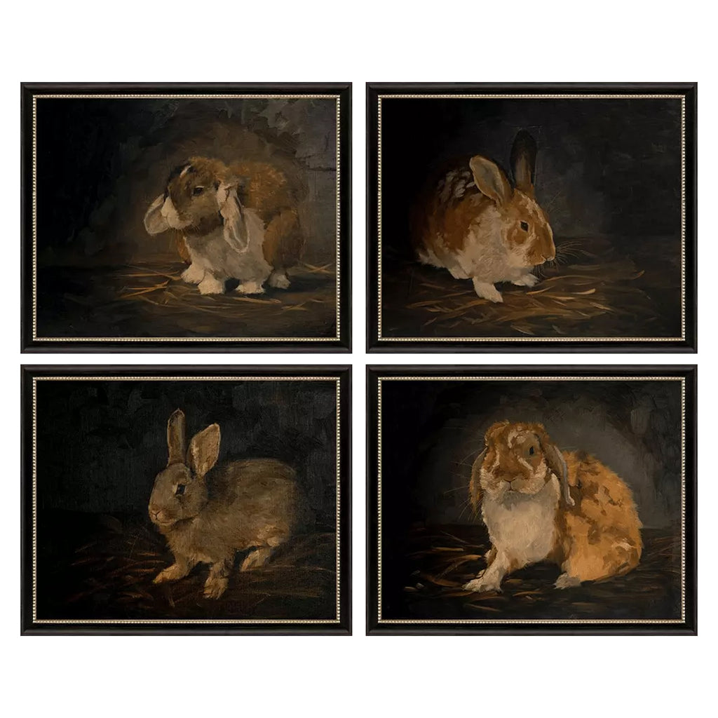 A traditional rabbit series is a timeless classic. Framed in an aged black painted wood with washed antique gold beaded lip.