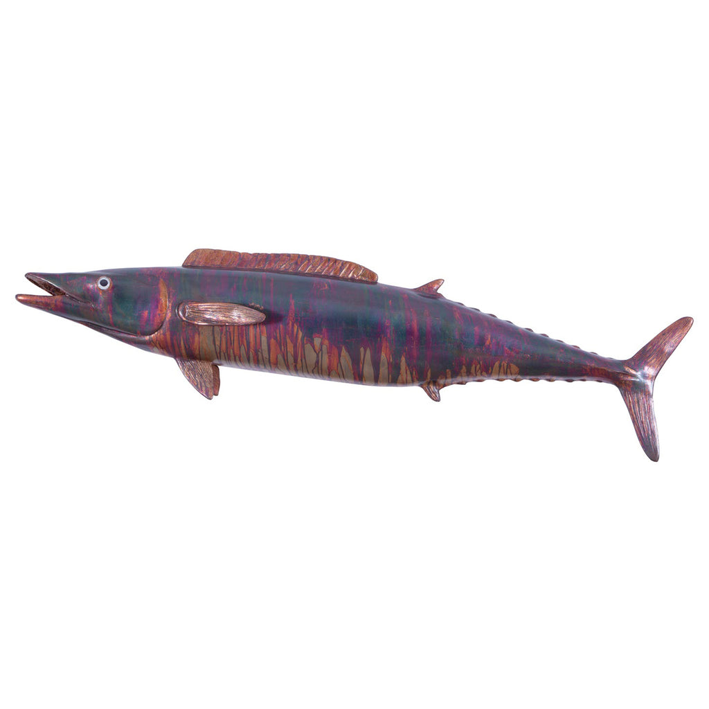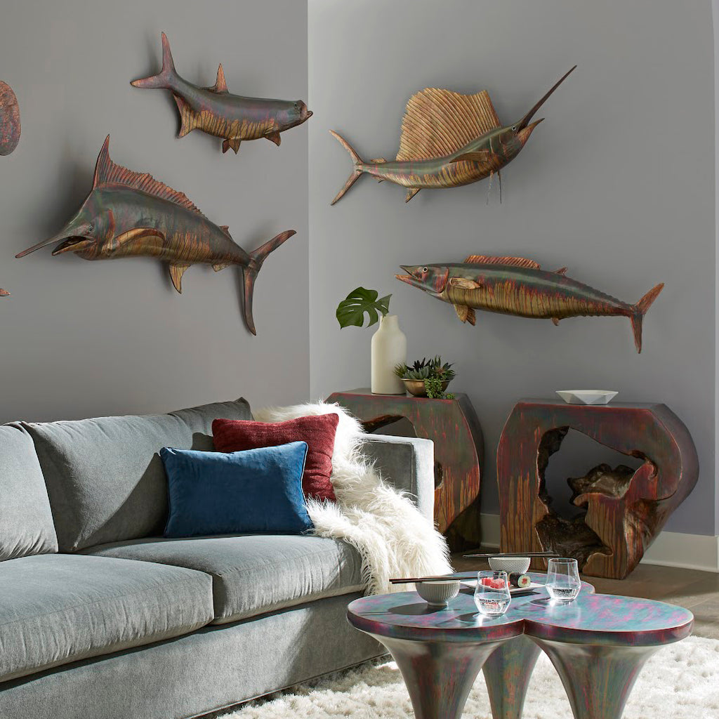 The Wahoo Fish Wall Sculpture is made of composite in a copper patina or silver leaf finish. This likeness of the seafaring creature is a chameleon of style—hang it in a modern kitchen and it takes on a zesty panache; place it in a child’s bedroom and it will become a playful element in the space. Whether you have a lakefront home, a beachfront condo, or an urban oasis, the Wahoo Fish Wall Sculpture with its luminous finish will bring the watery world inside. Powerful on its own, group this sculpture in multiples to create a school of fish for added impact.