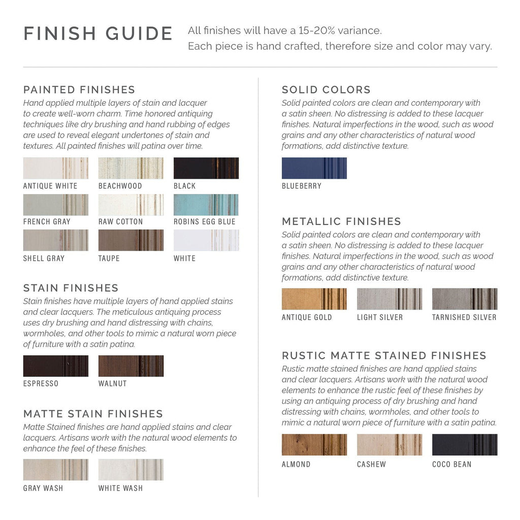 • Samples available upon request, Hand applied finish will have 15-20% variance