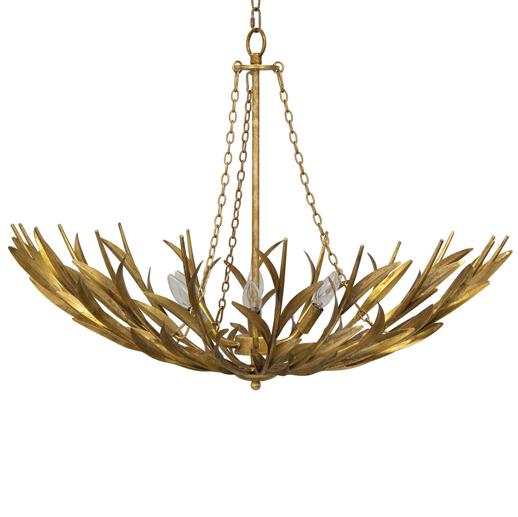 Cast reeds form a supportive basket for this six-light fixture, with its botanical influence and traditional feel. The reeds are supported by chains and affixed to a middle post that hangs elegantly from the ceiling. The River Reed Basin Chandelier has organic elements with a modern flair.
