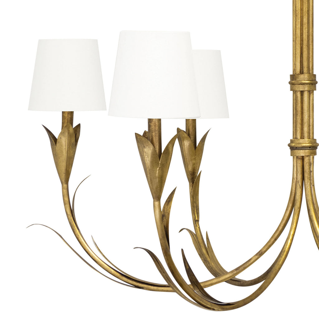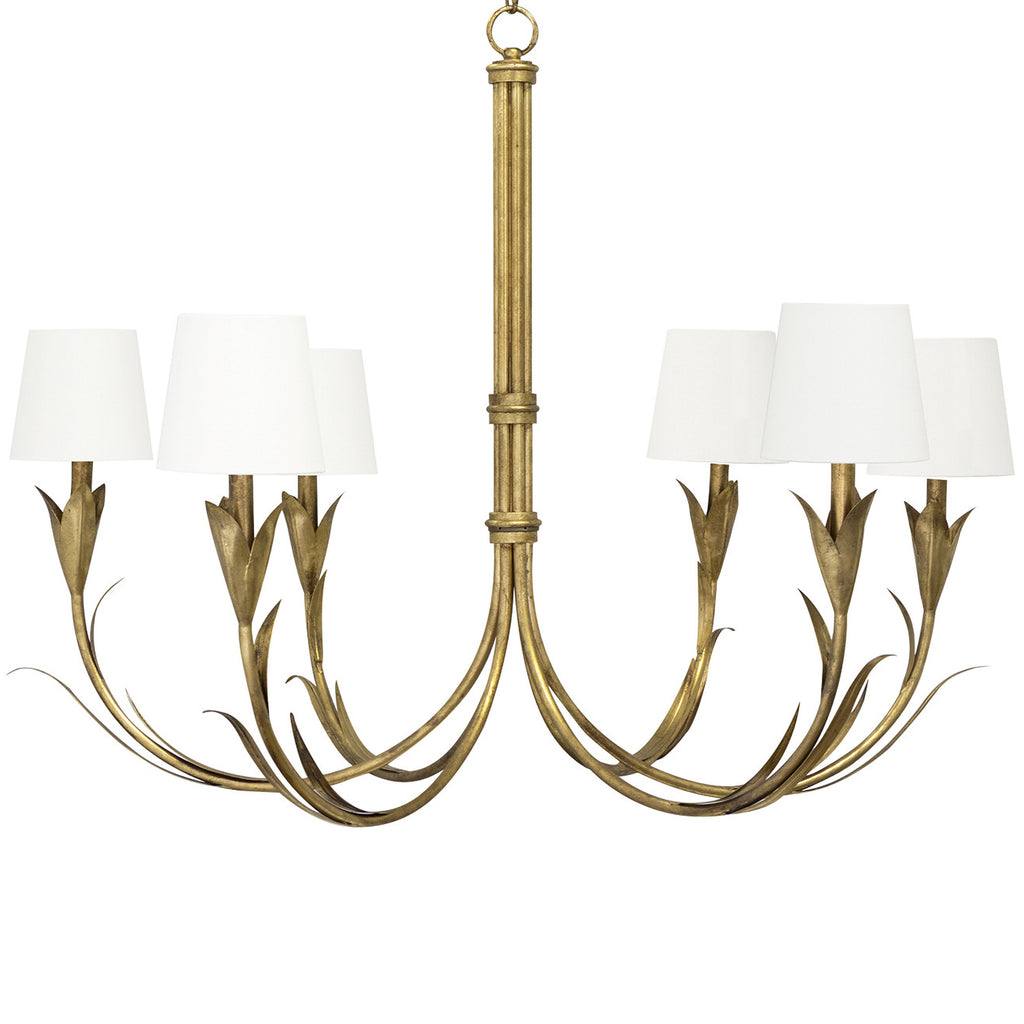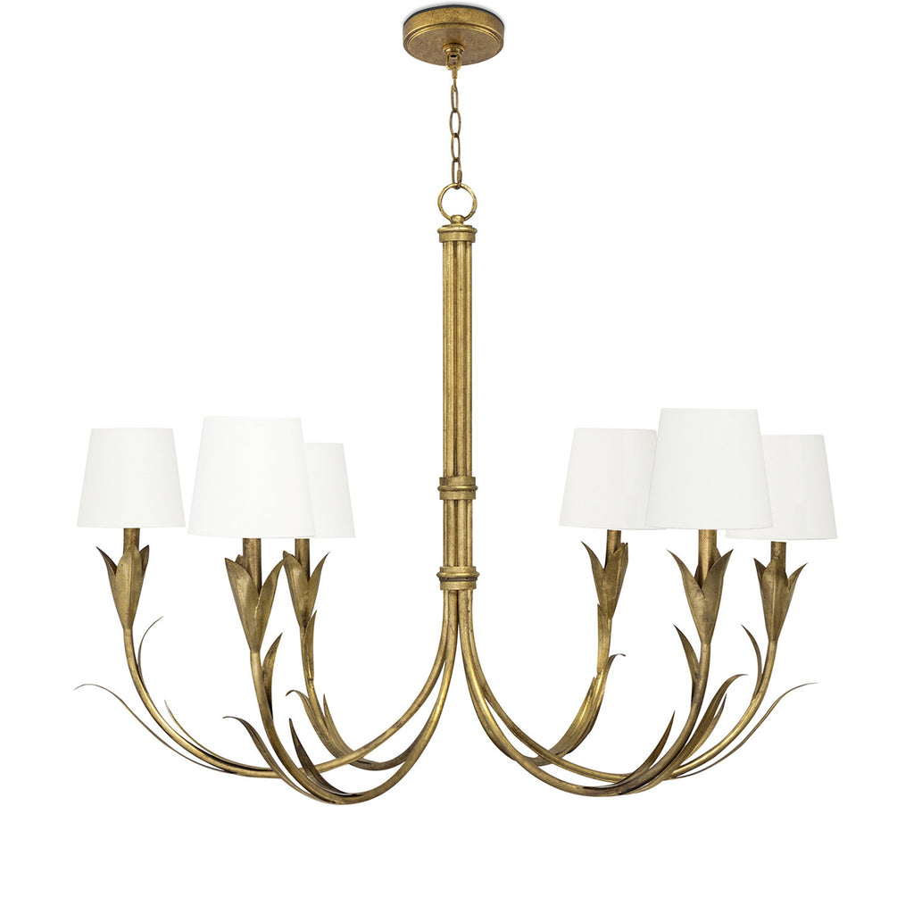 With its botanical influence and beautiful finish, the River Reed Chandelier is the ideal fixture for any traditional living space. Six reeded arms reach upward toward delicate natural linen shades, joined in the middle of the fixture with two detailed bands. This six-light fixture is suspended on an elegant chain, adorning a room with organic, natural glamour.