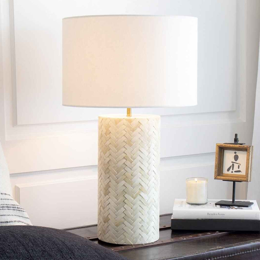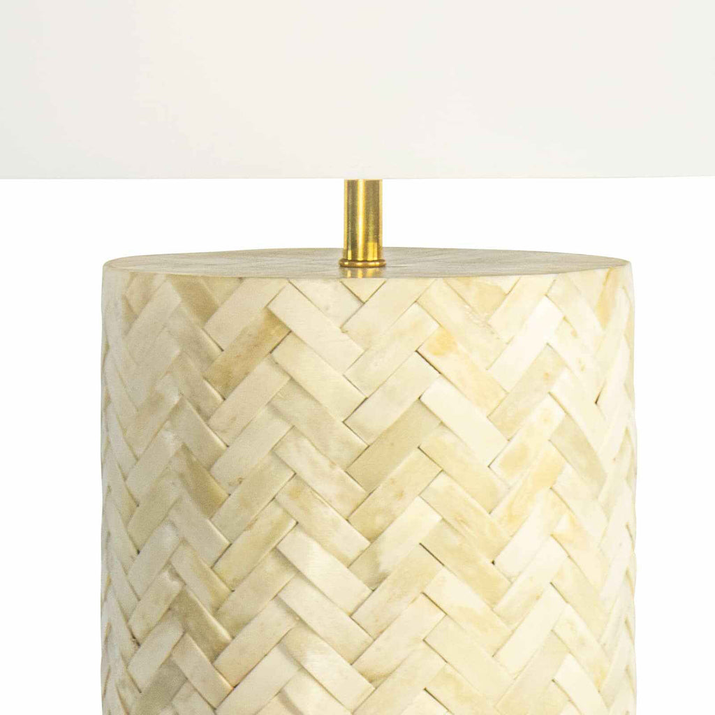 Natural bone is hand-inlaid onto the column base of the Trellis Table Lamp in a classic herringbone pattern. The varying tones of the bone creates a beautiful mosaic effect and a texture that summons eyes for a closer look. Place this substantial lamp in an entryway, bedroom or living space for a bit of neutral drama. The look is finished with a classic drum shade in natural linen and natural brass finishings.