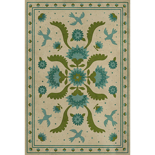 The Azure Moss vinyl floor cloth from the Williamsburg Applique collection was inspired by vintage linoleum. Perfect for kitchens, baths, screened in porches and patios, the durable vinyl floorcloths are easy to clean and always lay flat. Vinyl floorcloths are made with two-ply vinyl with latex padded backing, designed to be fade-resistant in direct sunlight and durable against the elements but work best in controlled outdoor environments.