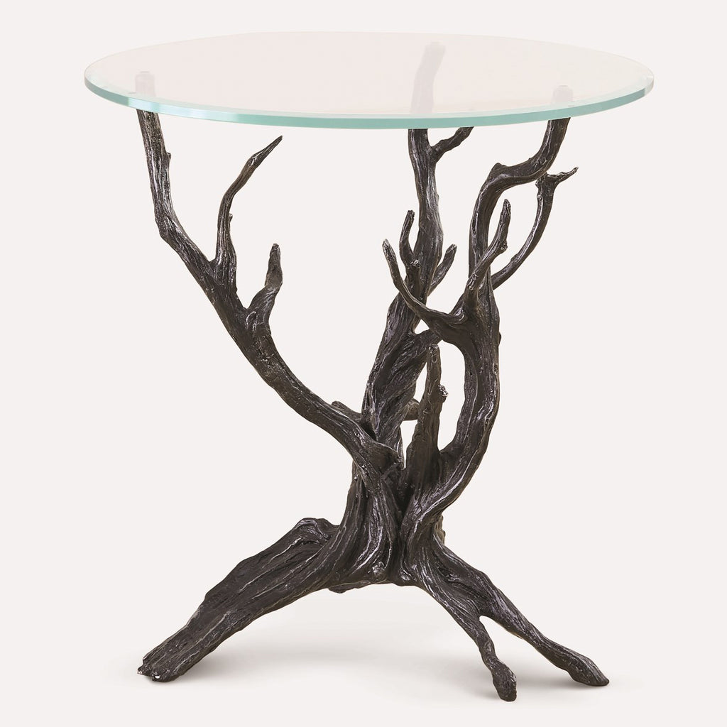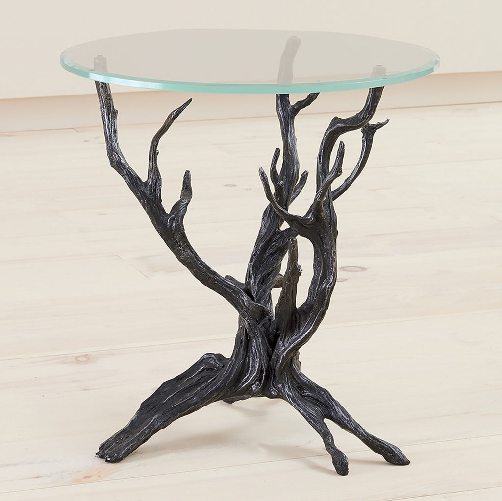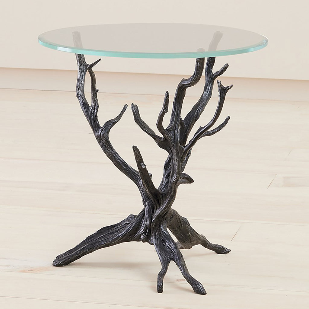 The Monterey End Table features a rustic sand-casted iron frame with a hand-painted natural iron finish. The tempered clear glass surface adds a sleek contrast to the textured frame, making it a versatile and stylish addition to any living space.