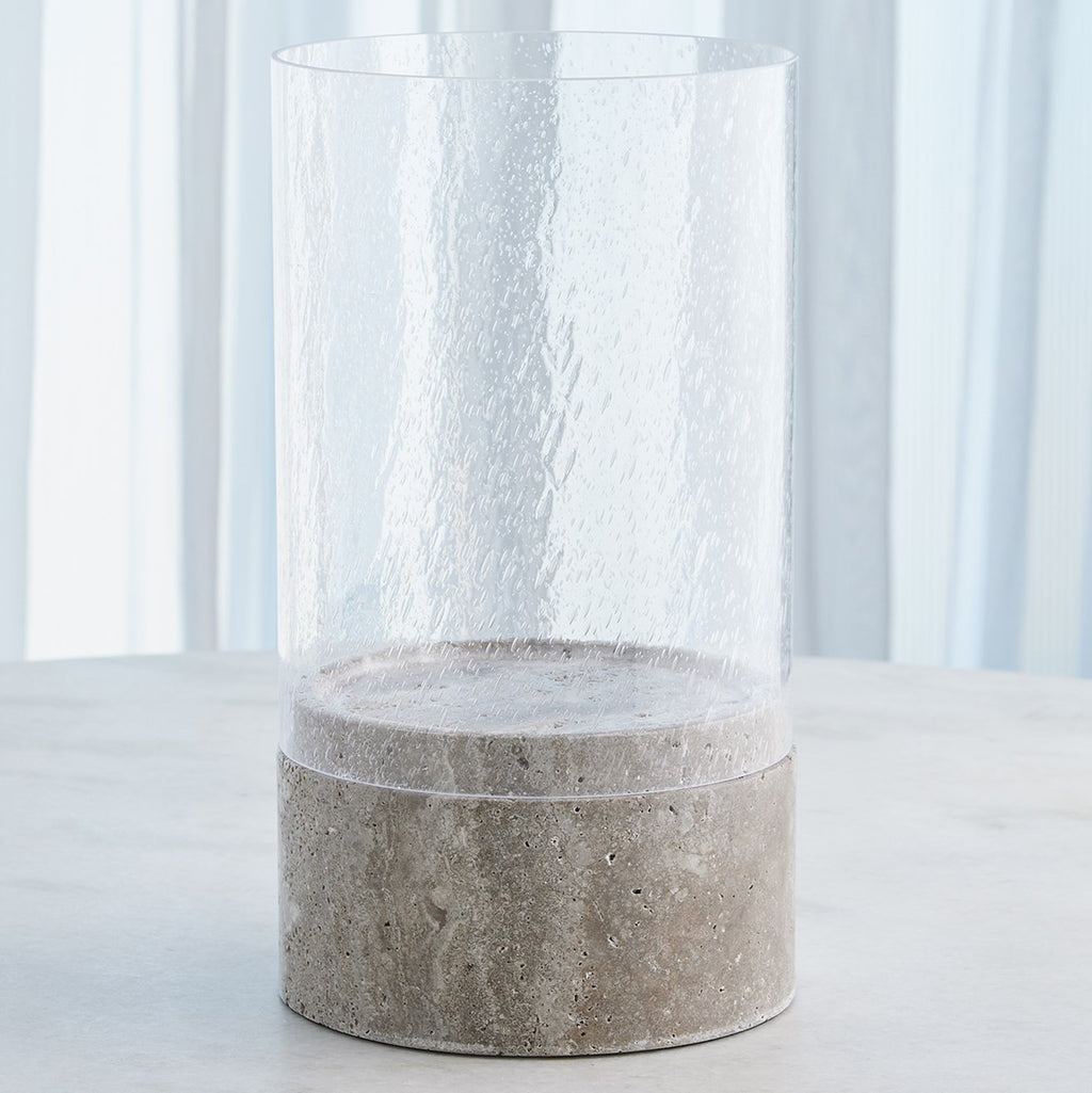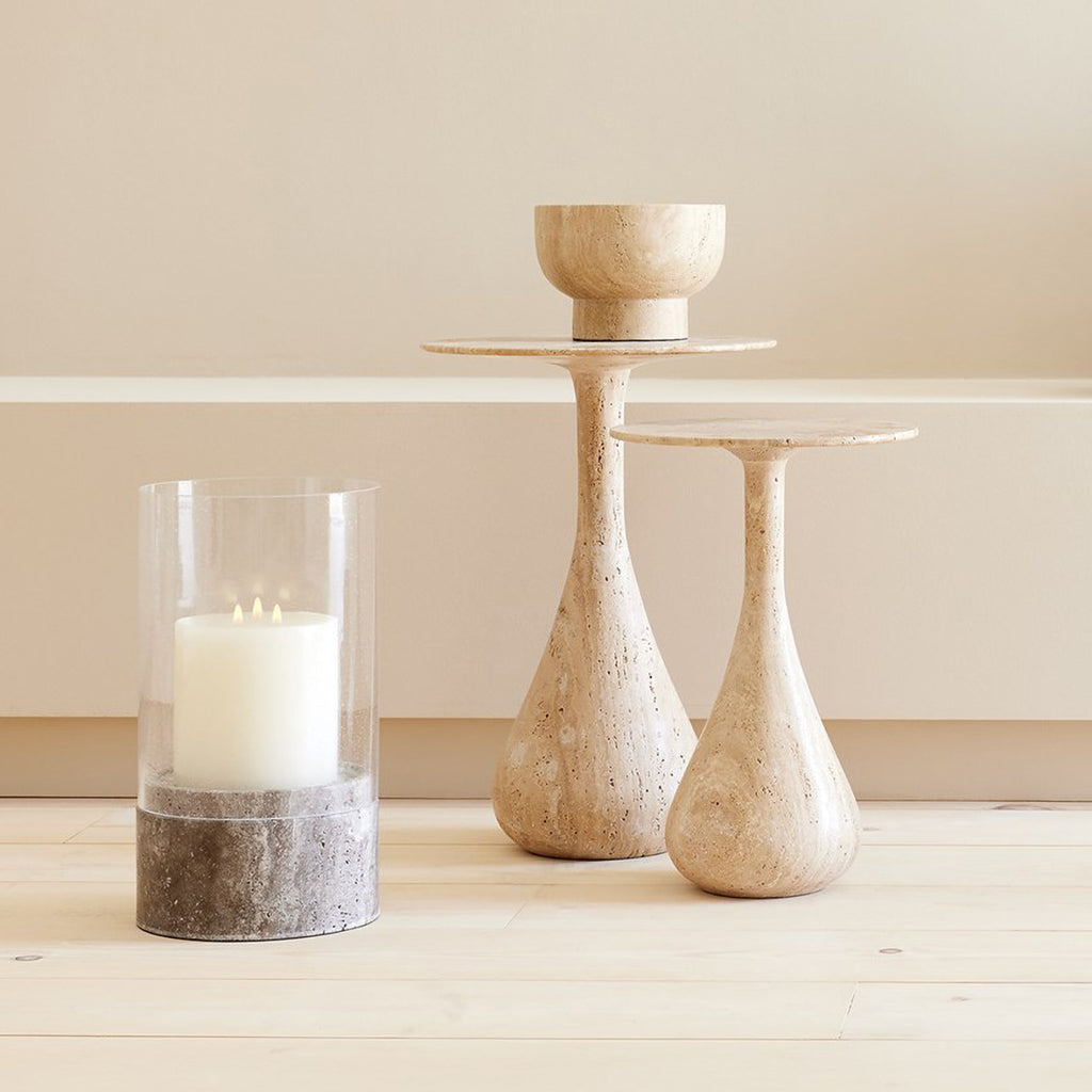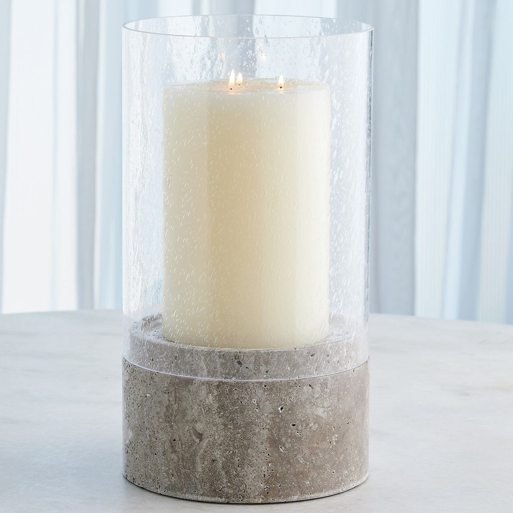 The Priory Hurricane is expertly carved from a solid piece of titanium travertine, showcasing its natural beauty. It features a seeded glass hurricane that beautifully diffuses candlelight, creating a warm and inviting ambiance. As travertine is a natural product, please be aware that there will always be variations in veining and color. This is to be expected and makes every travertine product uniquely your own.