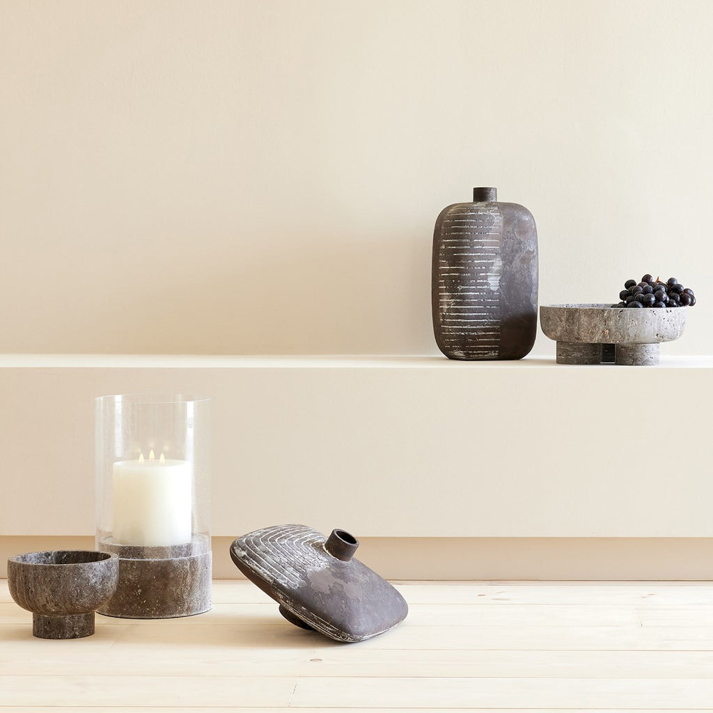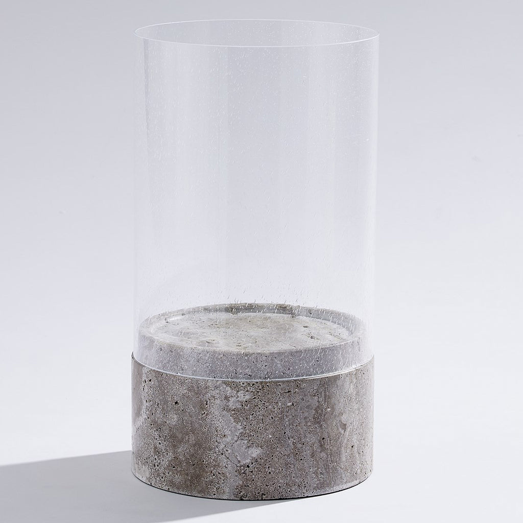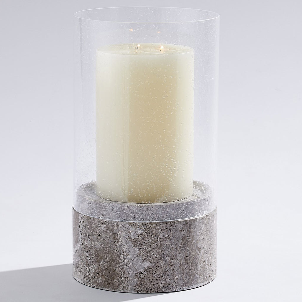 The Priory Hurricane is expertly carved from a solid piece of titanium travertine, showcasing its natural beauty. It features a seeded glass hurricane that beautifully diffuses candlelight, creating a warm and inviting ambiance. As travertine is a natural product, please be aware that there will always be variations in veining and color. This is to be expected and makes every travertine product uniquely your own.