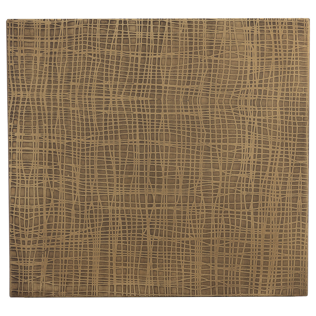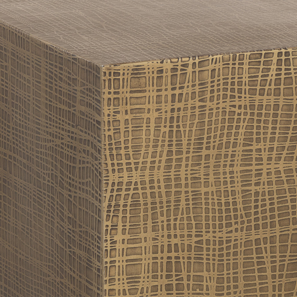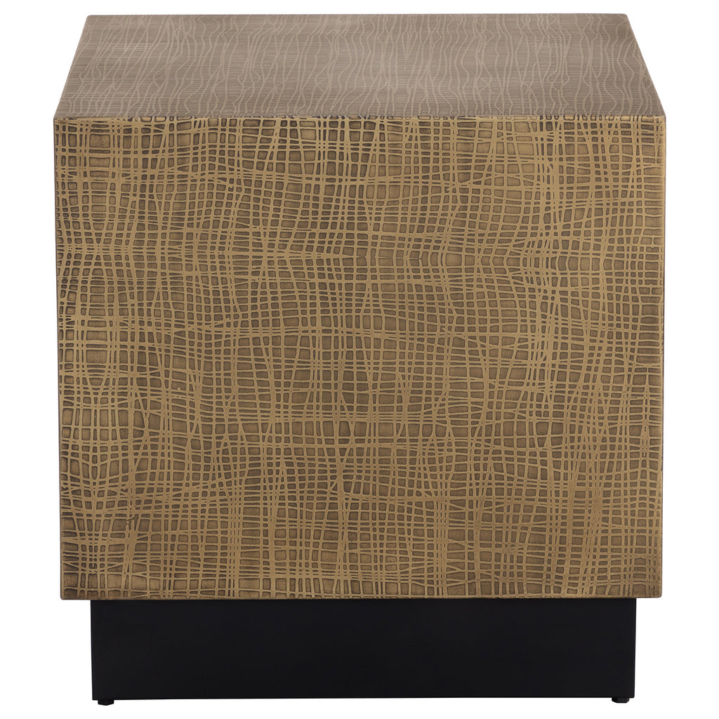 The Albans Side Table celebrates the beauty of handcrafted design. Constructed from iron with an antique brass finish, the structured tabletop features an intricate etched design. A black powder-coated iron base completes the look.