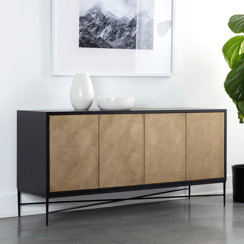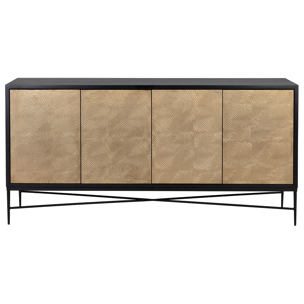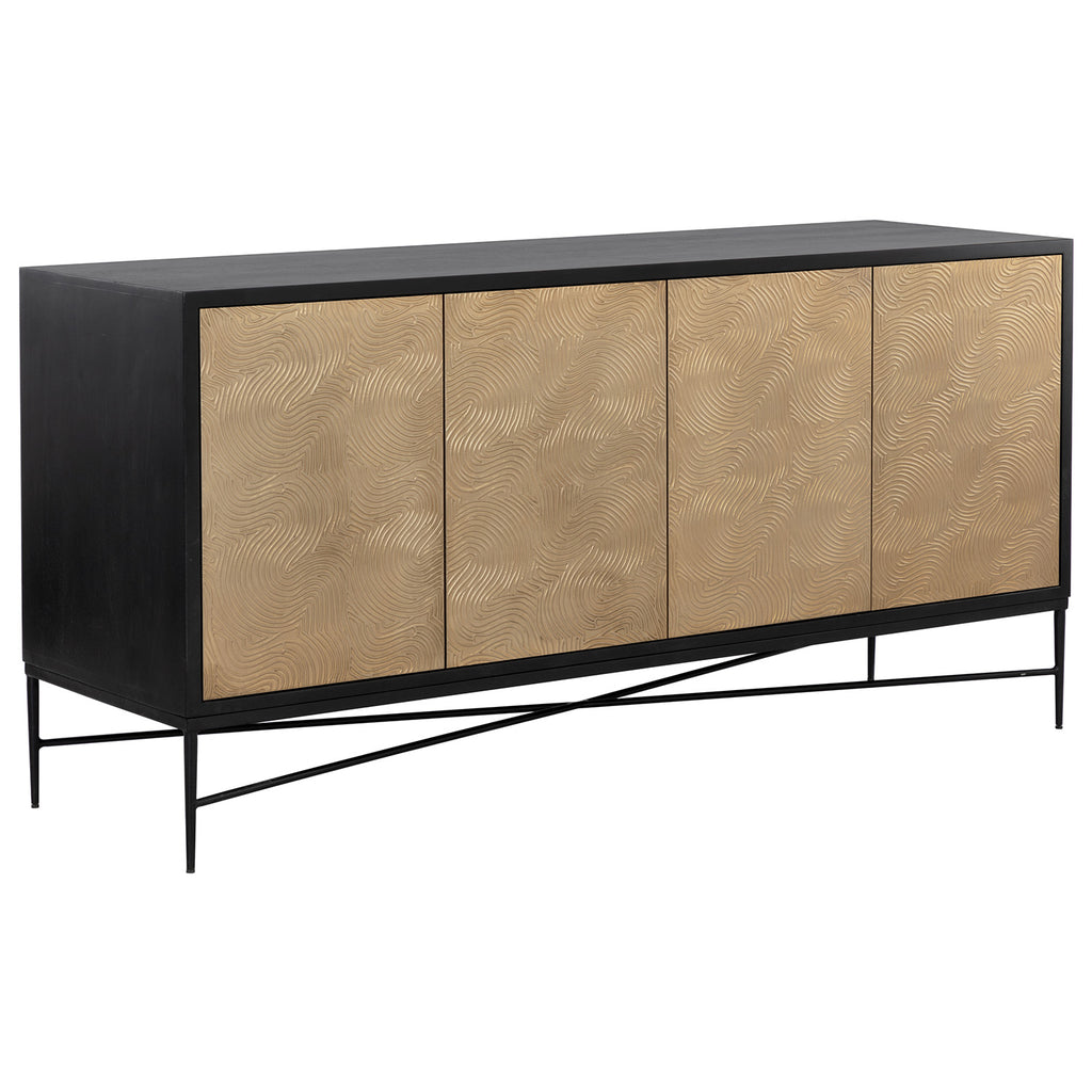 Infused with rich texture, this beautiful sideboard combines the timelessness of mid-century design with a modern twist. Features a solid mango wood frame with a black or gray finish and complemented with champagne gold aluminum cladding on door fronts. Completed with a black iron base.