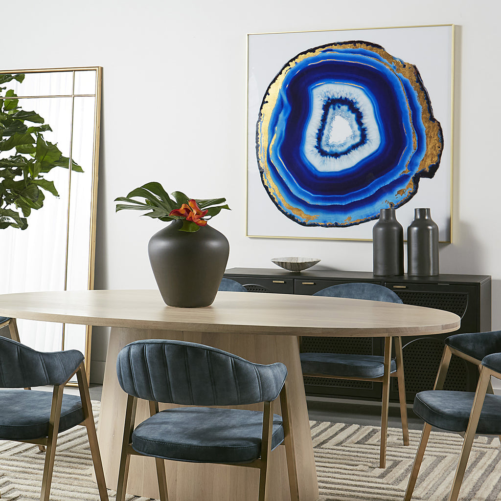 Shades of blue are complemented with a striking gold contrast on this modern artwork from our Luxe Art collection. Displaying the natural beauty of a rock formation, this piece features a reverse printed acrylic with hand-applied gold leaf accents. Finished with a gold metal frame.
