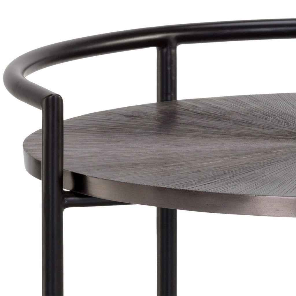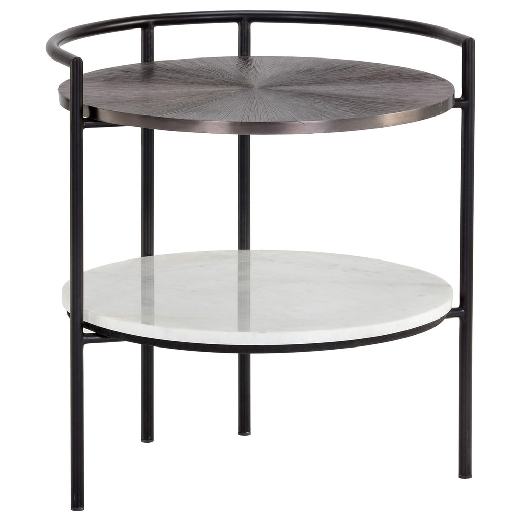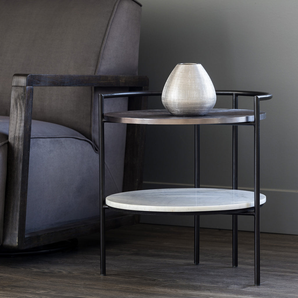 A contemporary nightstand that allows for a bright and airy space. Features a hand-etched and hand-hammered top crafted from iron with a tarnished bronzed gunmetal finish. A white marble shelf and a slender black steel frame completes the look.