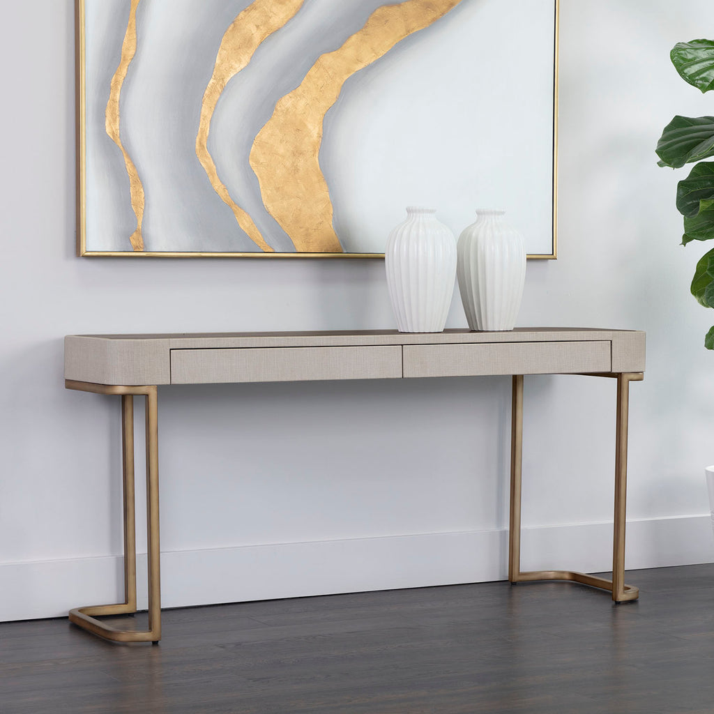 This contemporary console table is defined by its beautiful and gentle curves. Upholstered in cream faux leather with a brown oak veneer tabletop that is sure to impress. Includes two drawers and completed with a rustic bronze steel base.