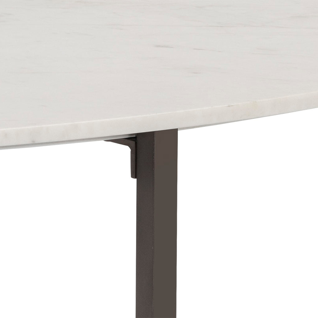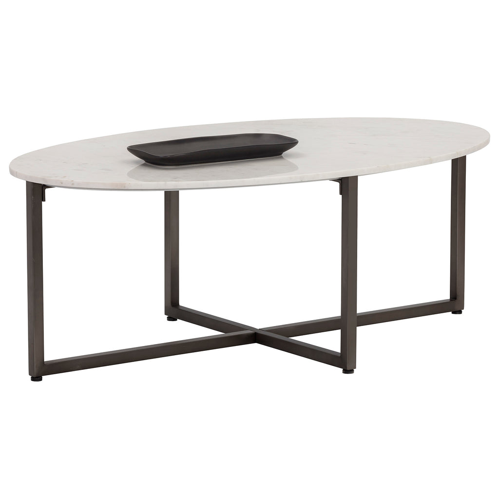 Boasting a minimalist design, this modern coffee table illustrates the contrasting beauty of smooth curves with rigid lines. Features an oval, white marble top with a stainless steel gunmetal base.