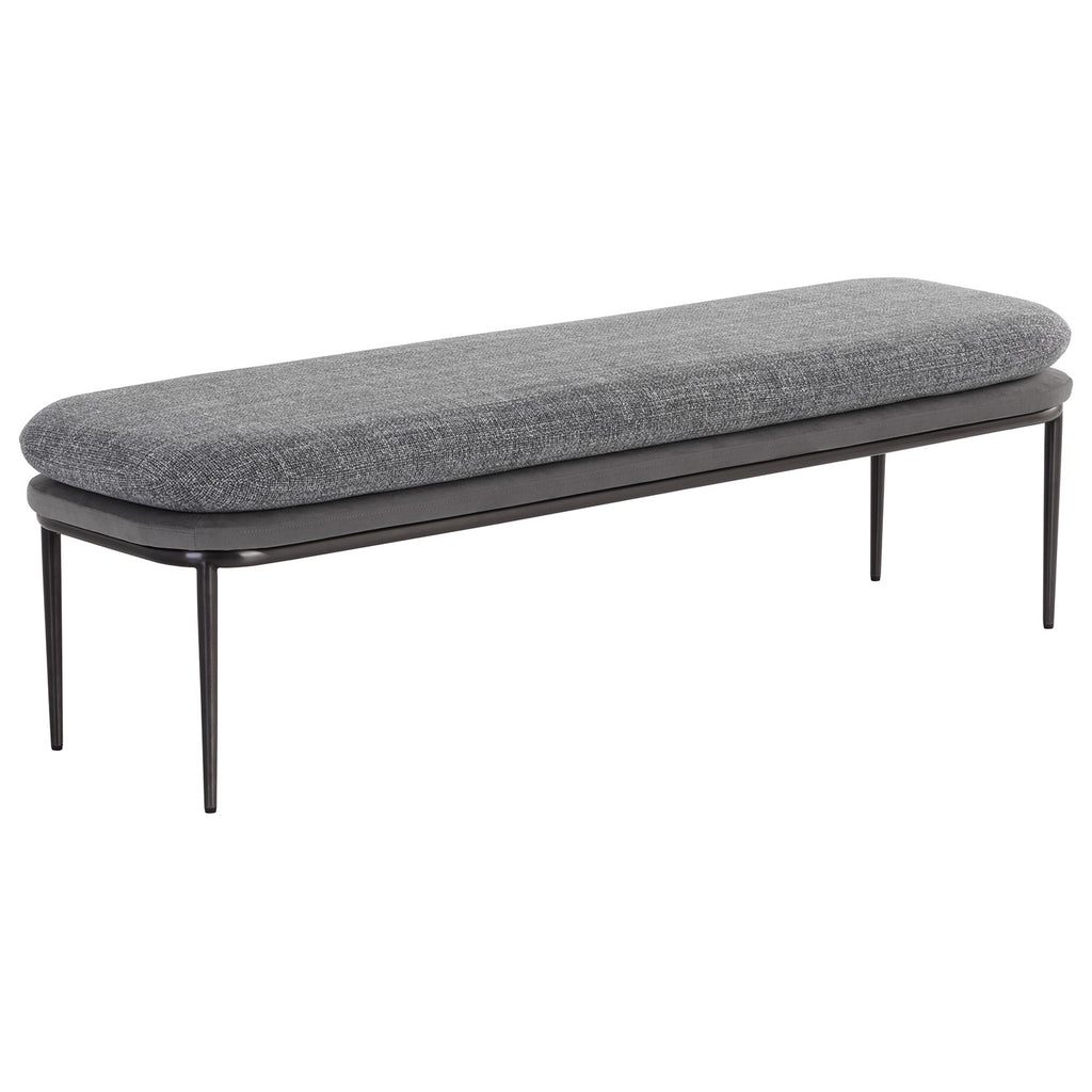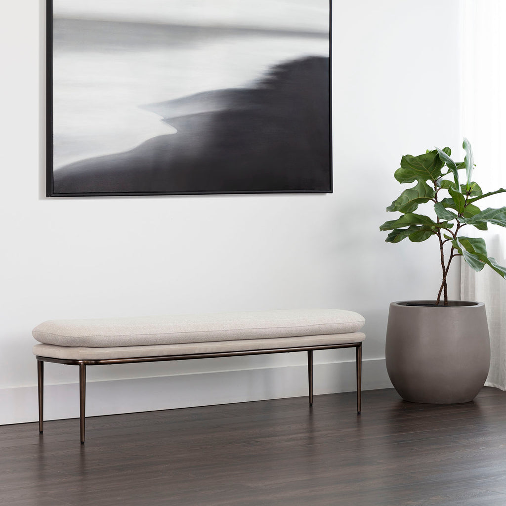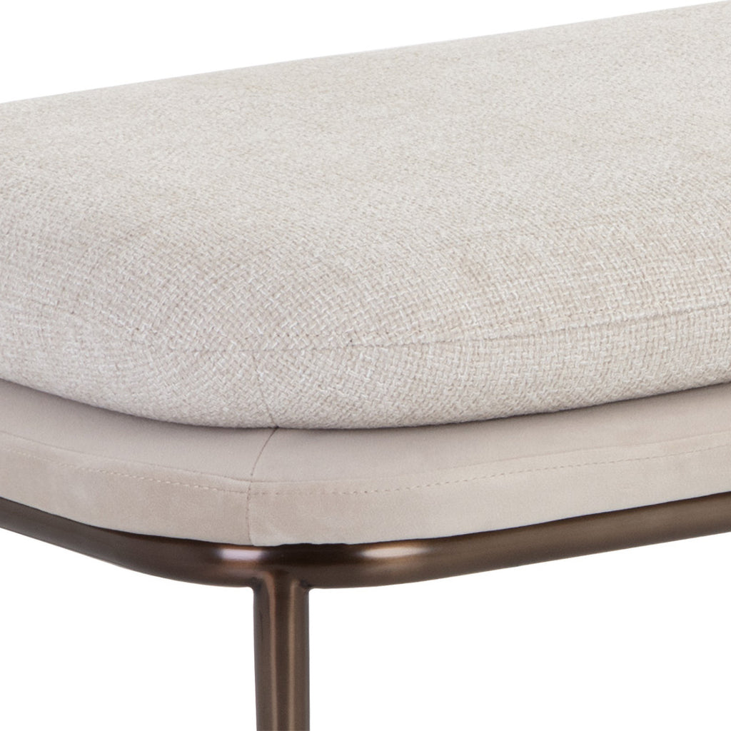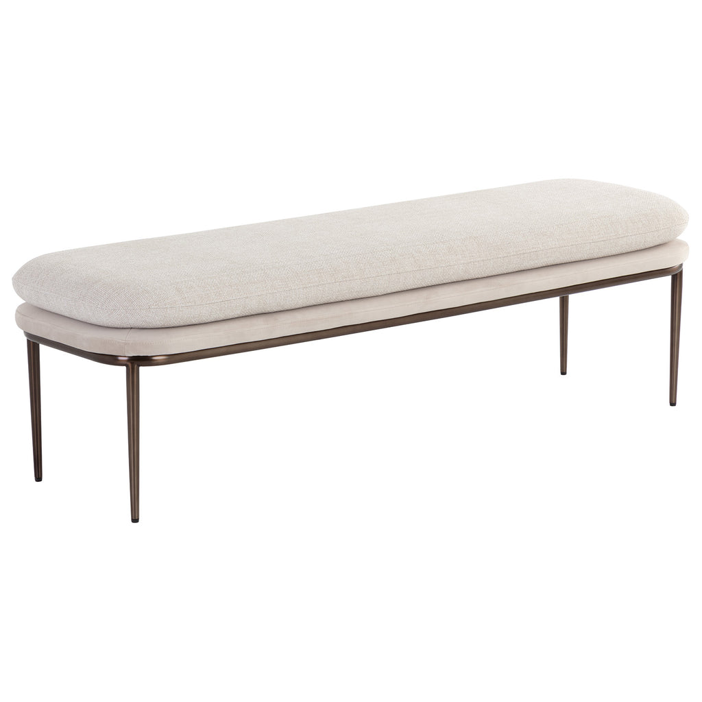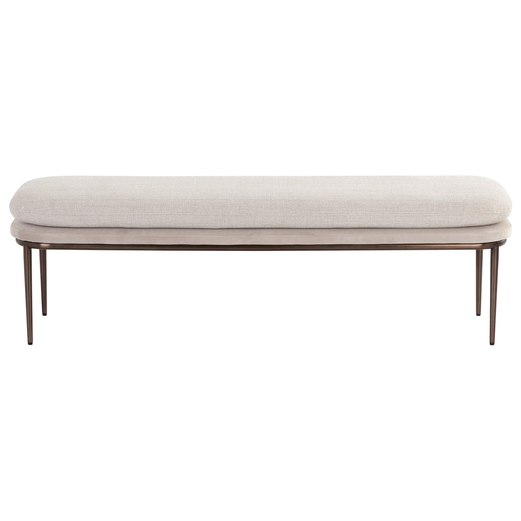 Rejuvenate any space with this contemporary bench that features a sleek design. Upholstered in chacha cream and meg taupe fabrics with a double cushioned seat. Completed with a dark bronze stainless steel base. Also available in a chacha grey and antonio charcoal fabric combination with a gunmetal stainless steel base. Coordinating stool also available.