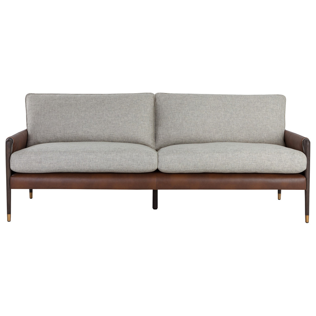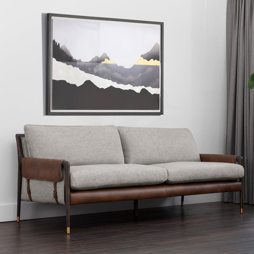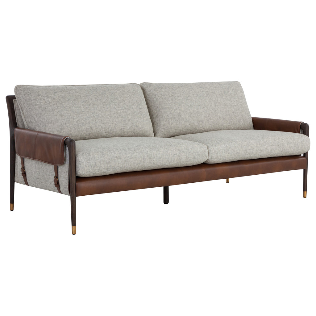 With influence from vintage design, this sofa evokes a charming and rustic mid-century appeal. Upholstered in vault fog performance fabric with accenting bravo cognac faux leather. Features dual buckle flap detailing on the armrests and completed with a brown solid oak wood frame with gold finished metal foot caps.