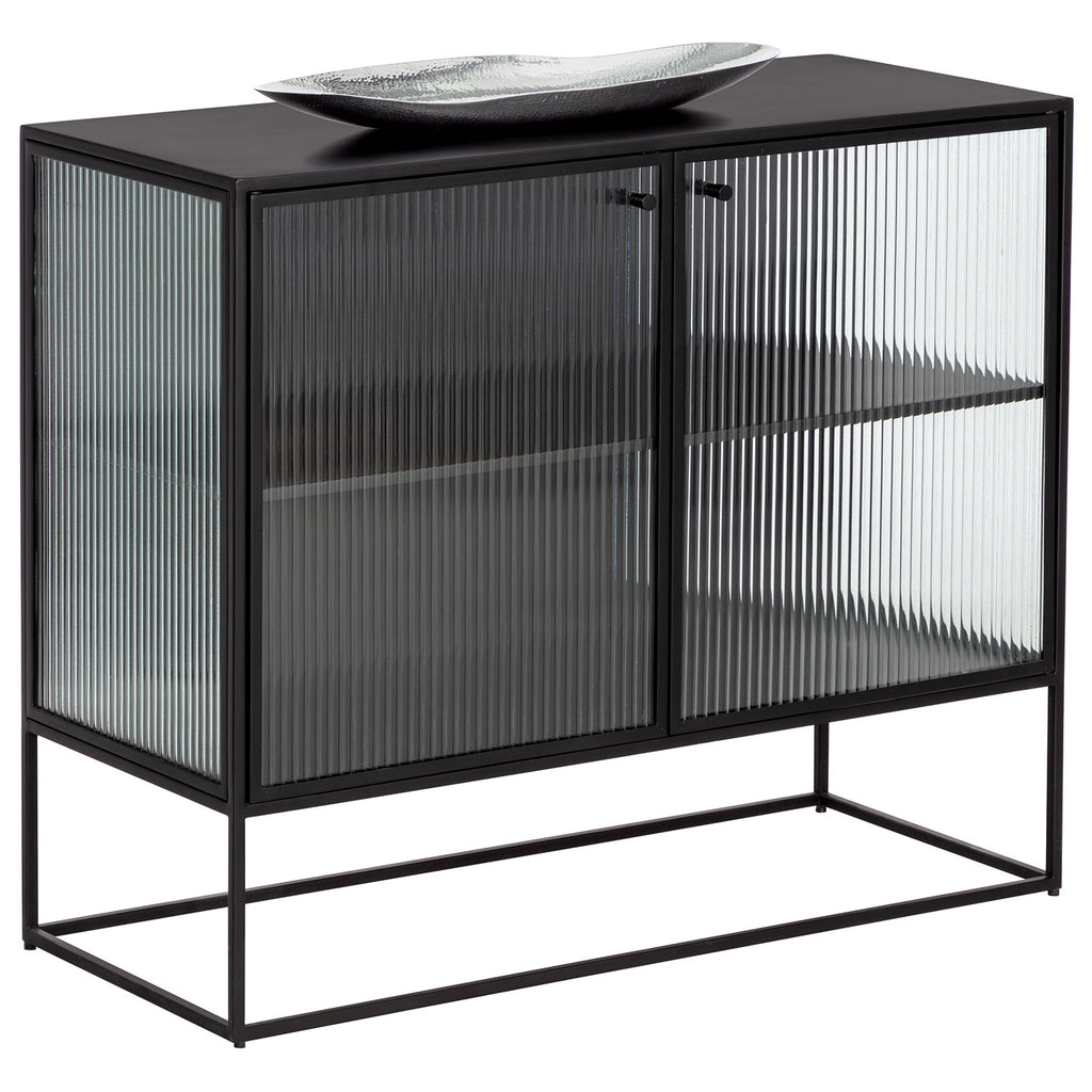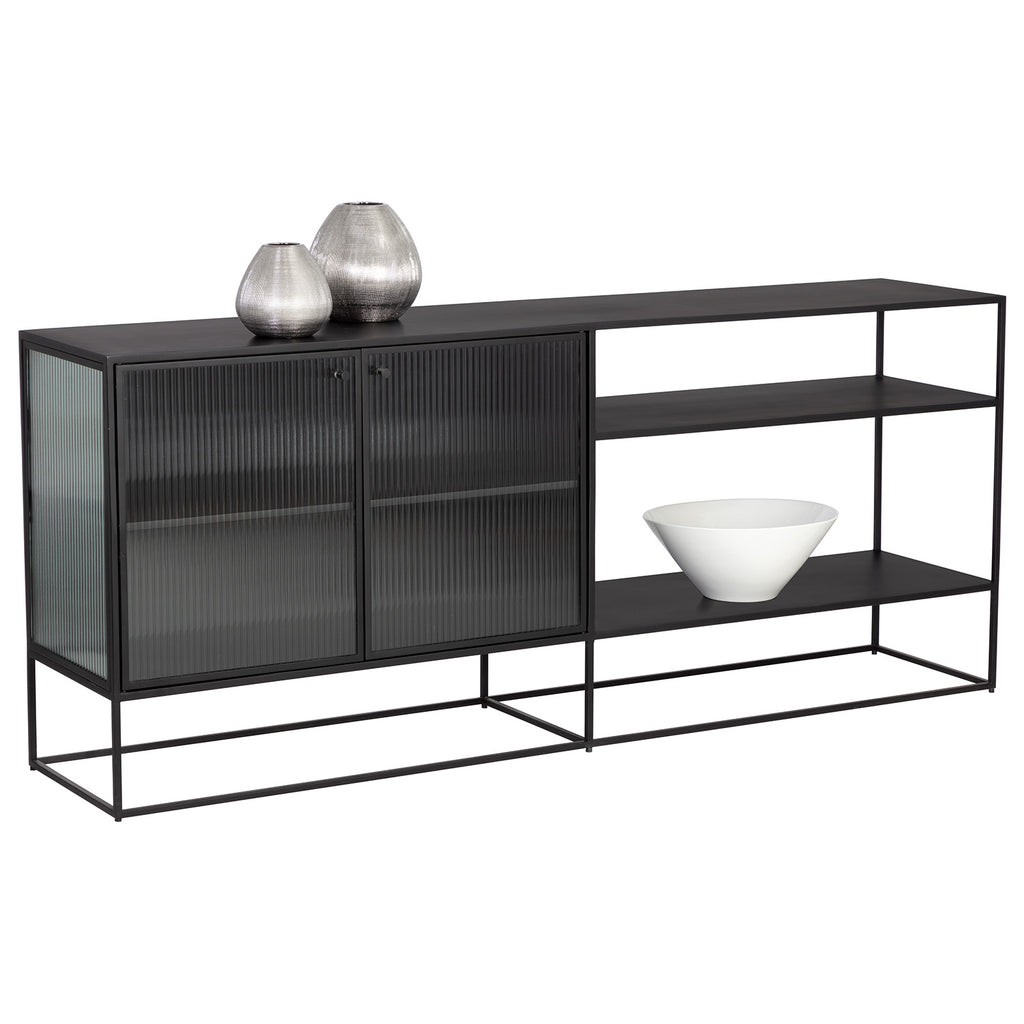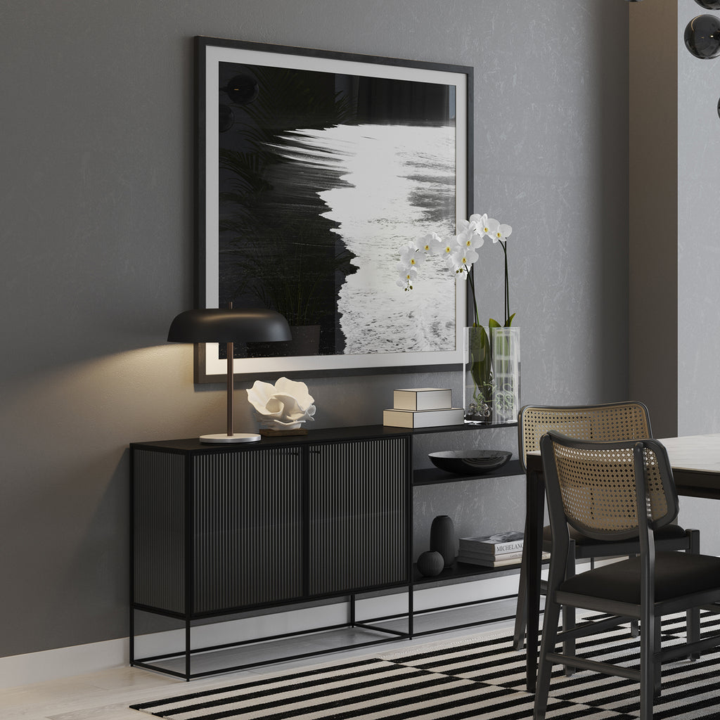 Inspired by mid-century modern designs, this large sideboard evokes a timeless and minimalist style. Crafted with a matte black iron frame and features fluted glass doors. Also available in a small size.