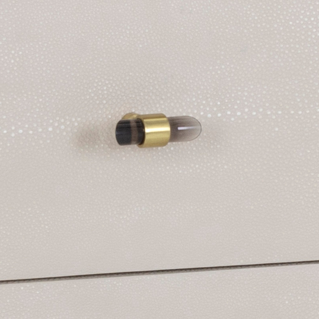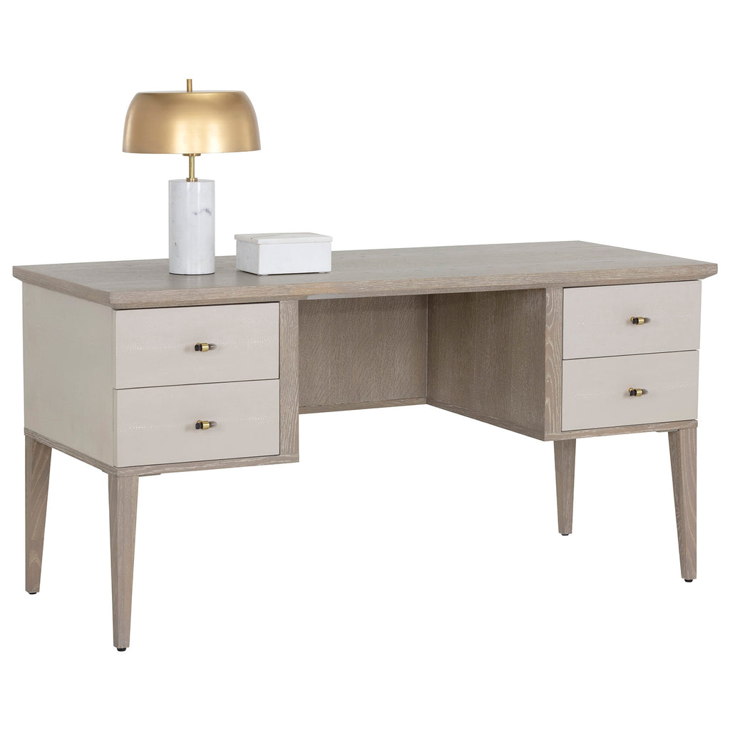 Boasting a professional and classic design, this magnificent desk is the ideal piece for productivity. Crafted from a wooden frame with a white ceruse oak veener top and features four drawers with oyster shagreen bonded leather coverings. Completed with antique brass iron handles and solid oak wood legs.