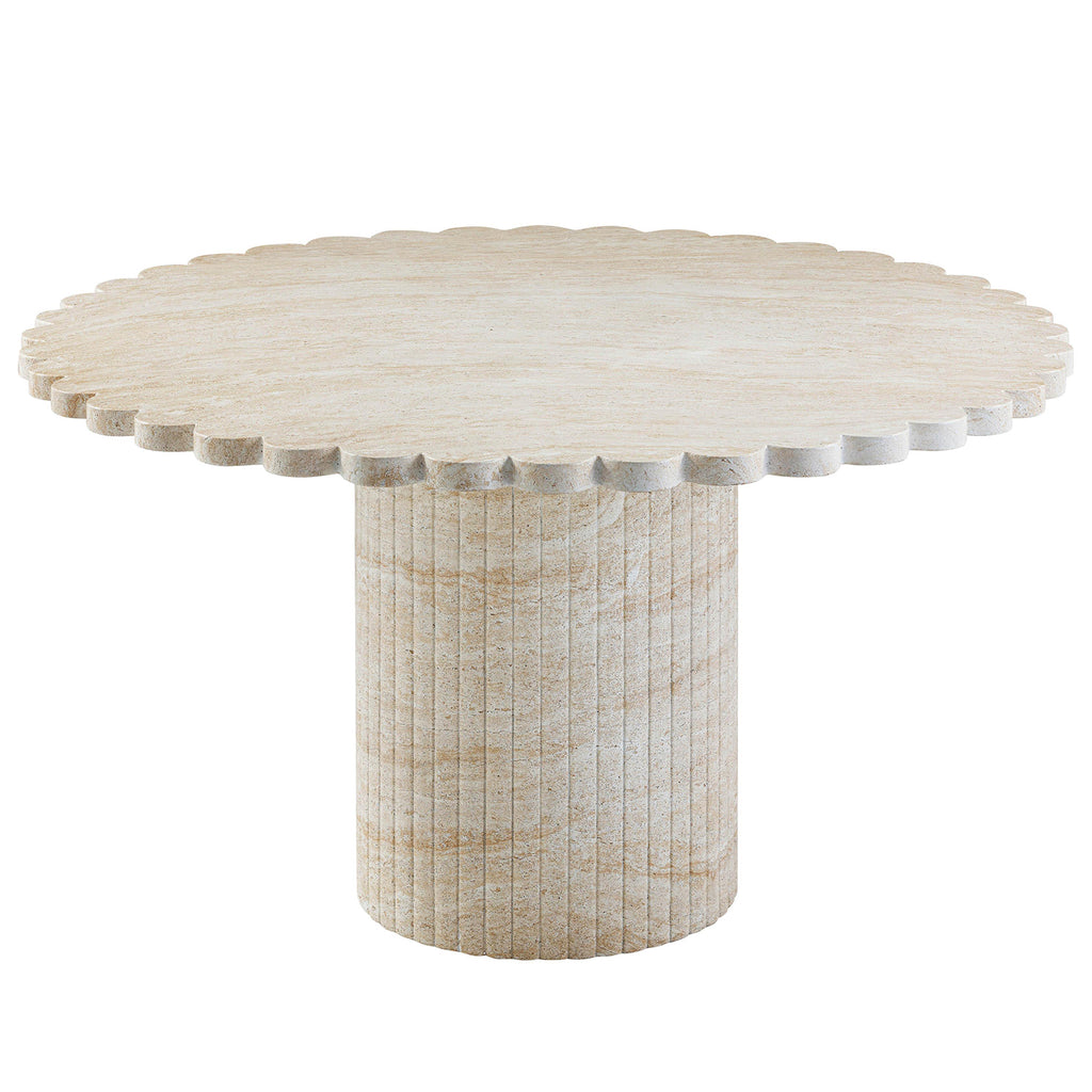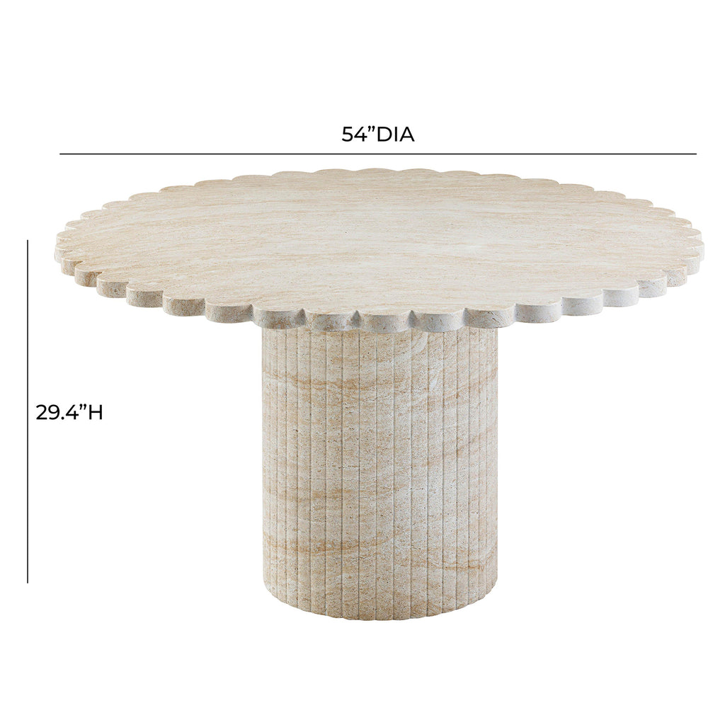 Experience the pinnacle of versatile dining with the TOV Furniture Blossom Washed Travertine Finish Indoor/Outdoor 54" Round Dining Table, masterfully crafted to redefine both your alfresco and home settings. The table's exquisite flower petal silhouette and precise vertical channeling on the base capture the essence of contemporary chic, fully enveloped in a serene, light washed travertine finish that boasts authentic surface texture. Generously proportioned with a 54" diameter, this dining marvel comfortably accommodates six guests, making it an ideal stage for your memorable gatherings.