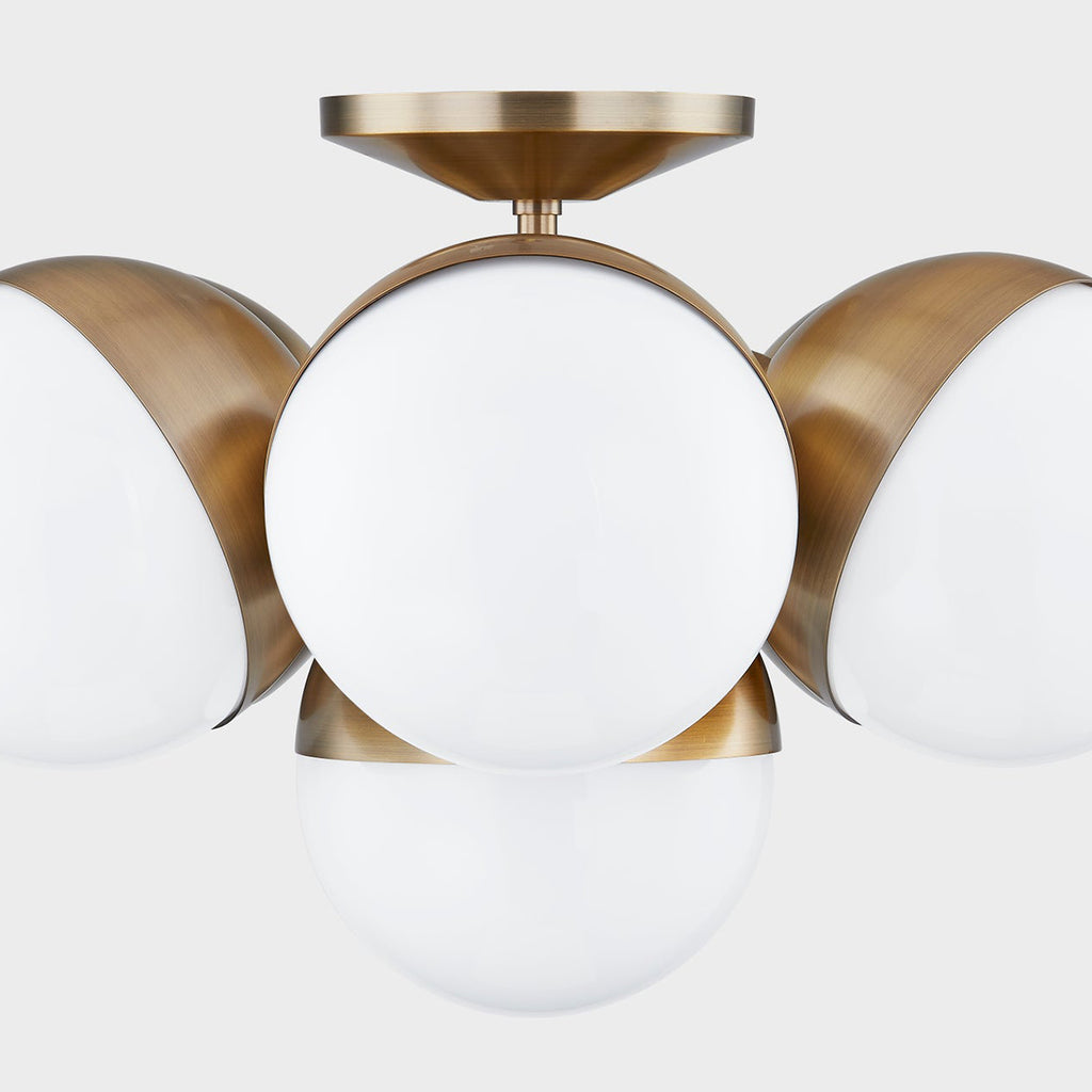 Warm tones and smooth lines soften Troy Cupertino Semi Flush Mount's modern industrial style. Opal glossy glass globes capped in Patina Brass are clustered around a metal stem at the center. The chandelier has a gorgeous cascading silhouette and the semi-flush mount makes a stunning statement close to the ceiling.