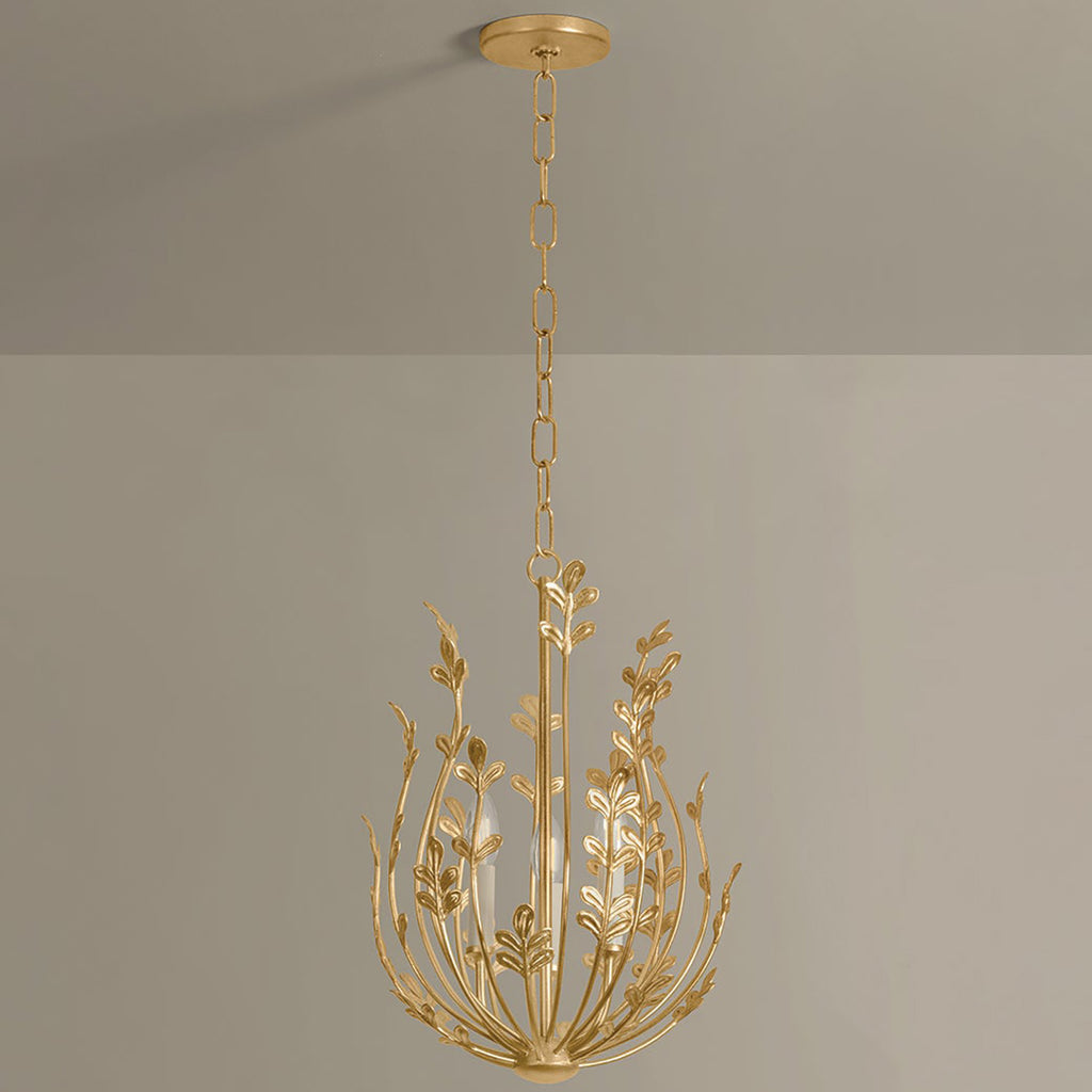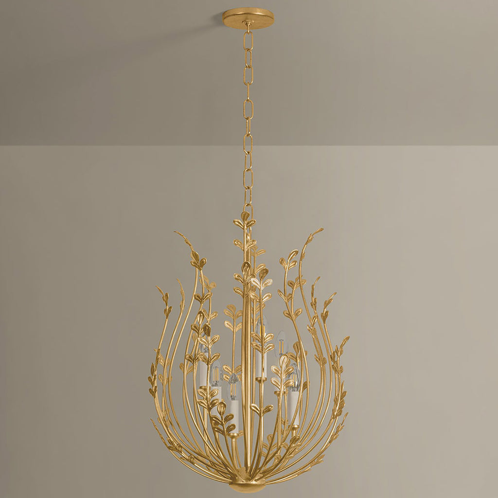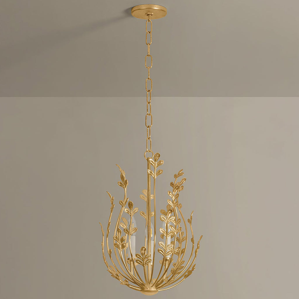 Somewhere between the concept of a pendant and a lantern floats the ethereal, botanically-inspired Troy Lighting Delmore. Made of iron and finished in Vintage Gold Leaf, the airy frame features sprightly curving stems accented by etched leaf details. 3 or 6 candles are nested within the delicate composition, creating a bright and joyous celebration of nature.