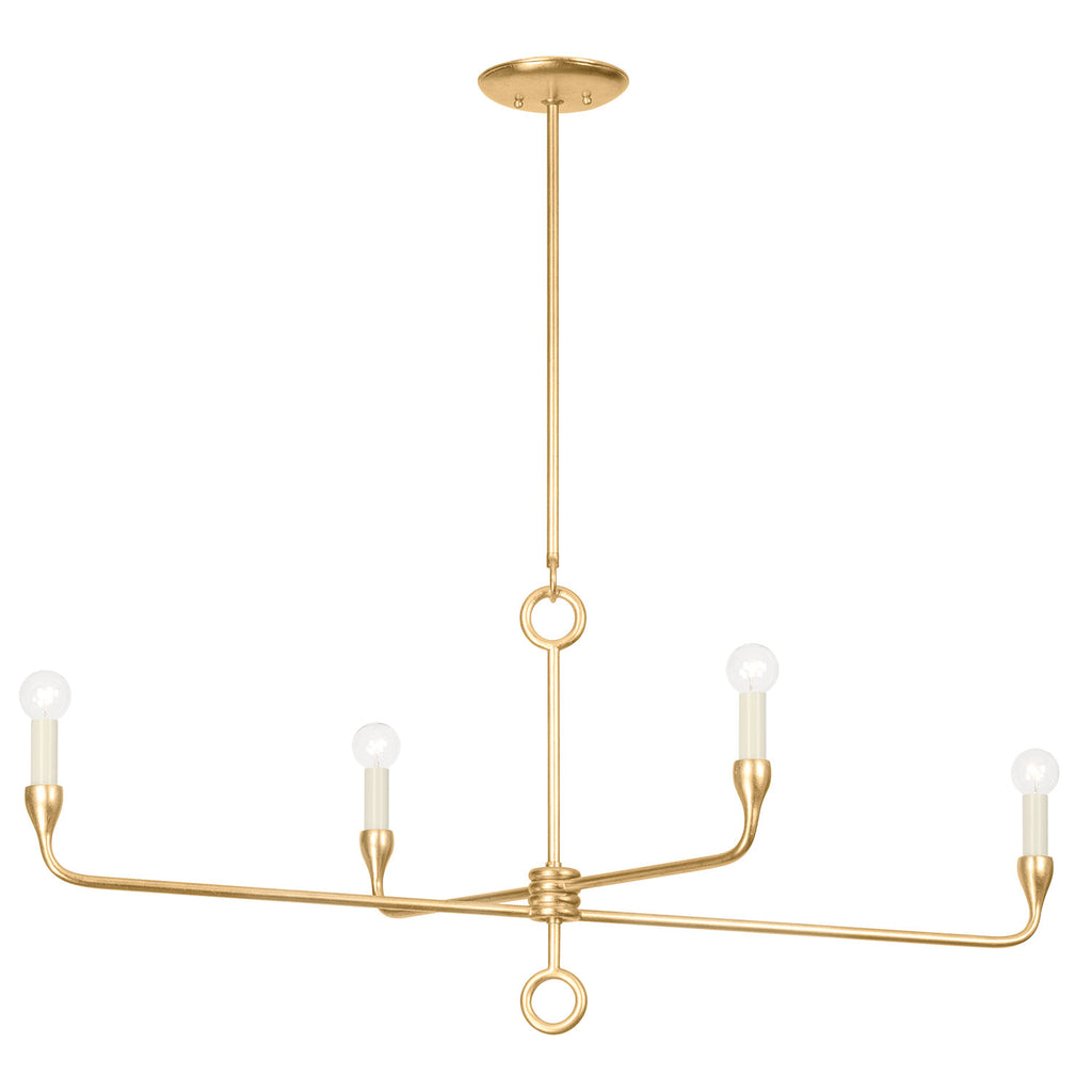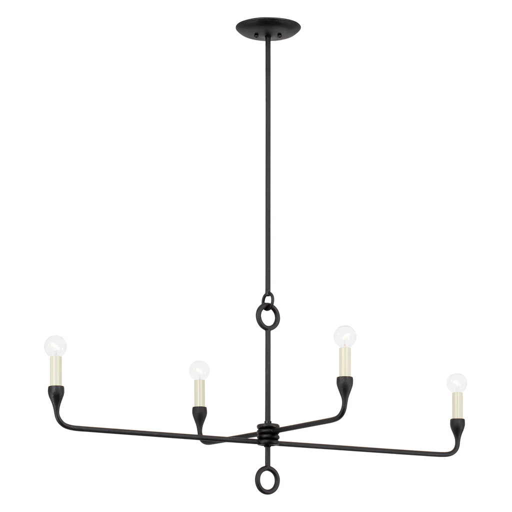 Casual, sophisticated, and little bit curious, express yourself with eclectic, artisan-made lighting by Troy. Linear arms extend from a totem-stacked coil center to hold candlesticks creating the Troy Orson chandelier's elongated, dramatic silhouette. Simple loop accents and textured Black Iron or Vintage Gold Leaf metalwork add to the sleek design. Make a stunning, modern statement throughout the home with the one-light wall sconce, six- or eight-light chandelier and four-light island fixture.