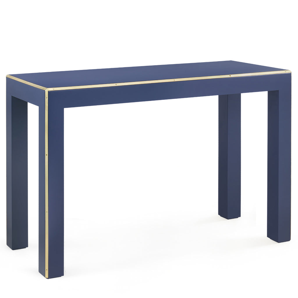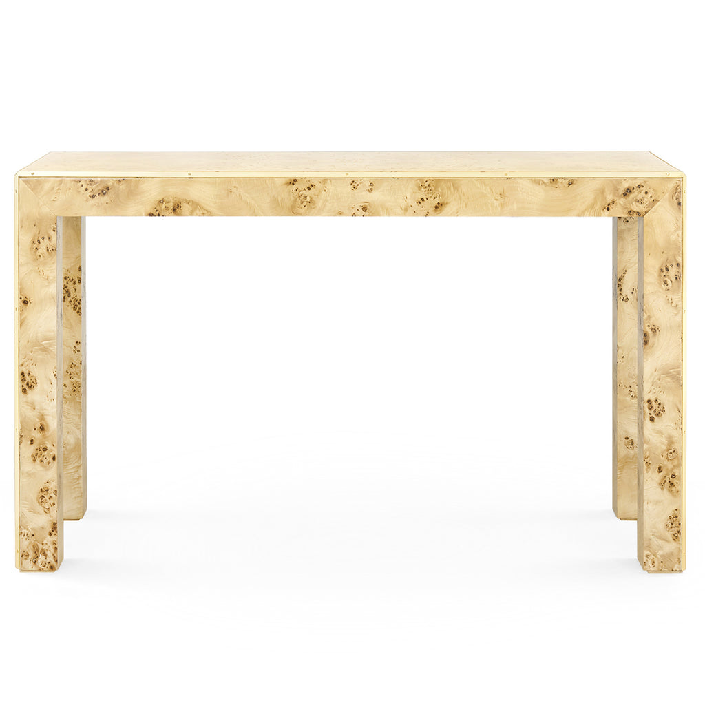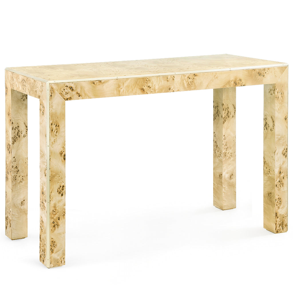 Crafted by skilled artisans, the Melissa Console epitomizes contemporary sophistication with its clean lines and sleek angles. Made from burl wood and accented by inset borders of brushed brass with decorative set screws, this piece exudes boldness and refinement. Versatile enough to complement various decor schemes, it adds a touch of luxury to any space, perfect for showcasing prized art pieces, lighting fixtures, or antiques.