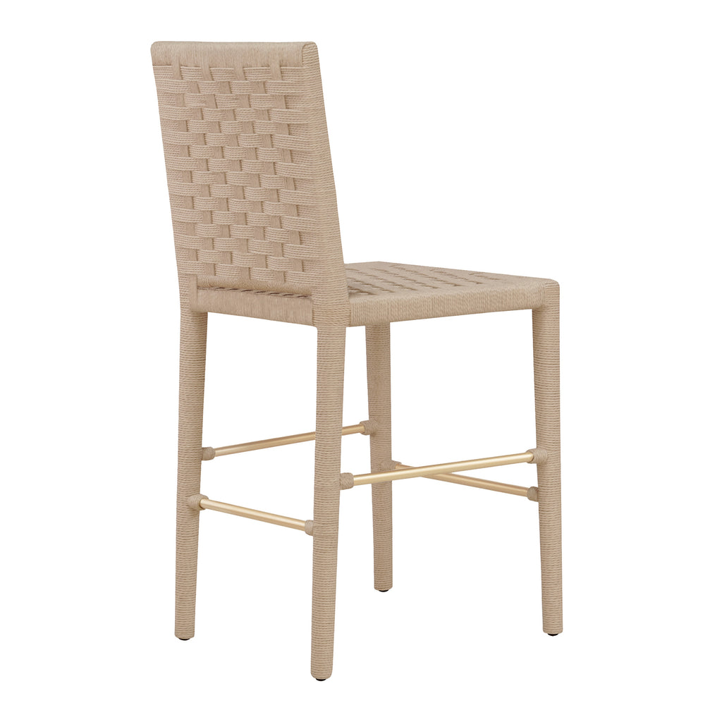Natural rope basketweave pattern counter stool with antique brass stretcher