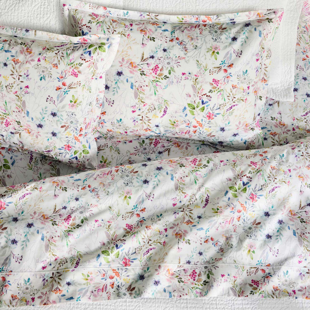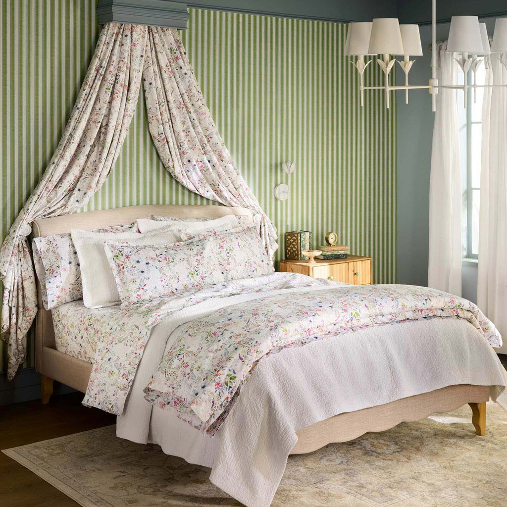 Sprigged with colorful wildflowers, Peacock Alley Chloe creates an enchanting look for the bed. Crafted in Portugal of smooth, long-staple cotton percale, it’s lightweight, breathable and cool to the touch, making it an excellent choice for warm sleepers. The sheet set is designed to be mixed and matched with other products in the Chloe collection.