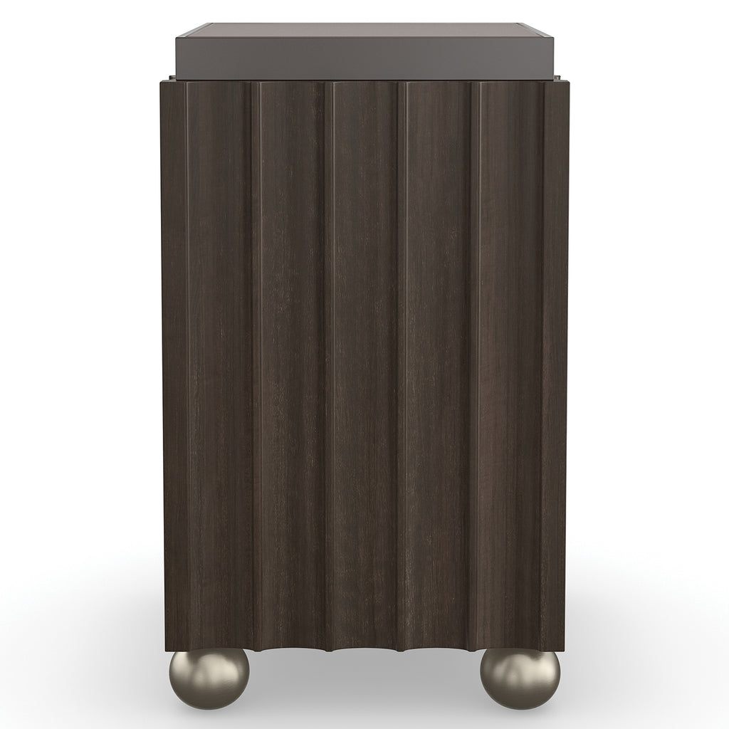 Small spot table or decorative pedestal, this simple yet sculptural form takes inspiration from Greco-Roman architecture. Defined by a fluted column, it features an inset Bronze Glass top framed in Dark Chocolate, and metallic ball feet in a Brushed Whisper of Gold for a hint of shimmer and ease of mobility. Style alongside a sofa or chair, or pair with Up To You to create a multi-dimensional, gallery-like display.