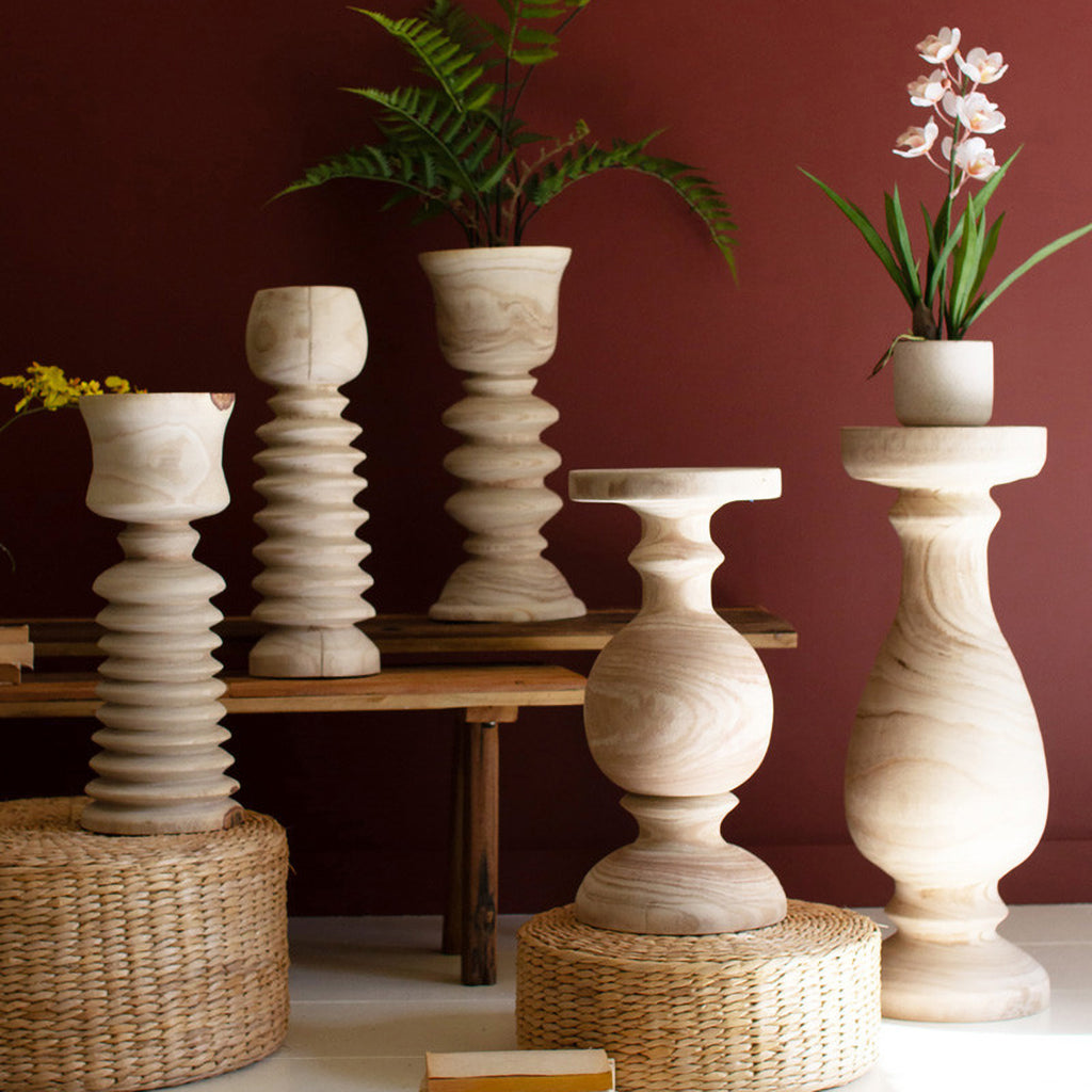 Turn heads with these turned wood towers with cups for candles, plants, or solo displays. This trio of turned towers stands alone or coordinates with other pieces to make your unique arrangement. Place them together or stagger them for a tiered look.