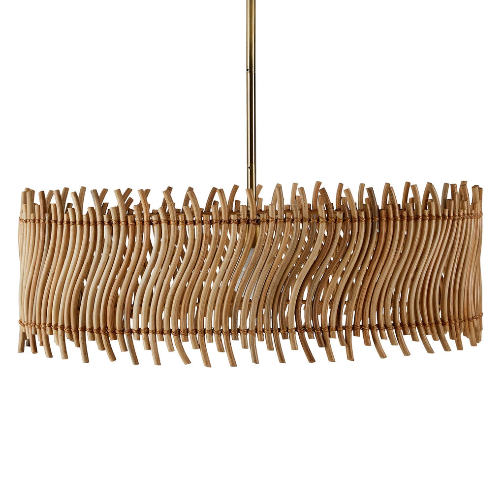 Waves of sinuous pencil rattan are bound together to form the sleek shade of our pendant light. Designed to let the illumination of a single bulb peek through, this impactful style is the perfect size for a smaller space such as a breakfast nook. Finished with a slim suspension pipe and canopy of antique brass-plated steel. Finish will vary.