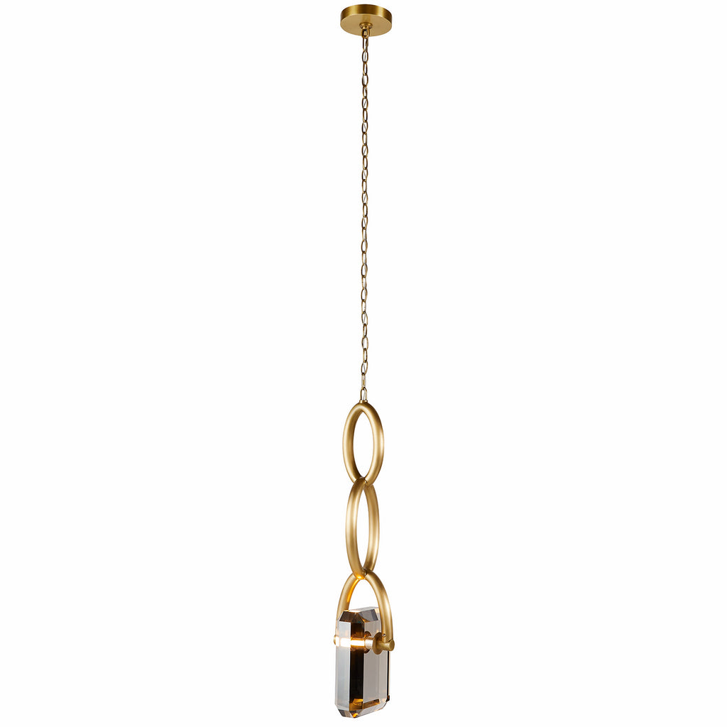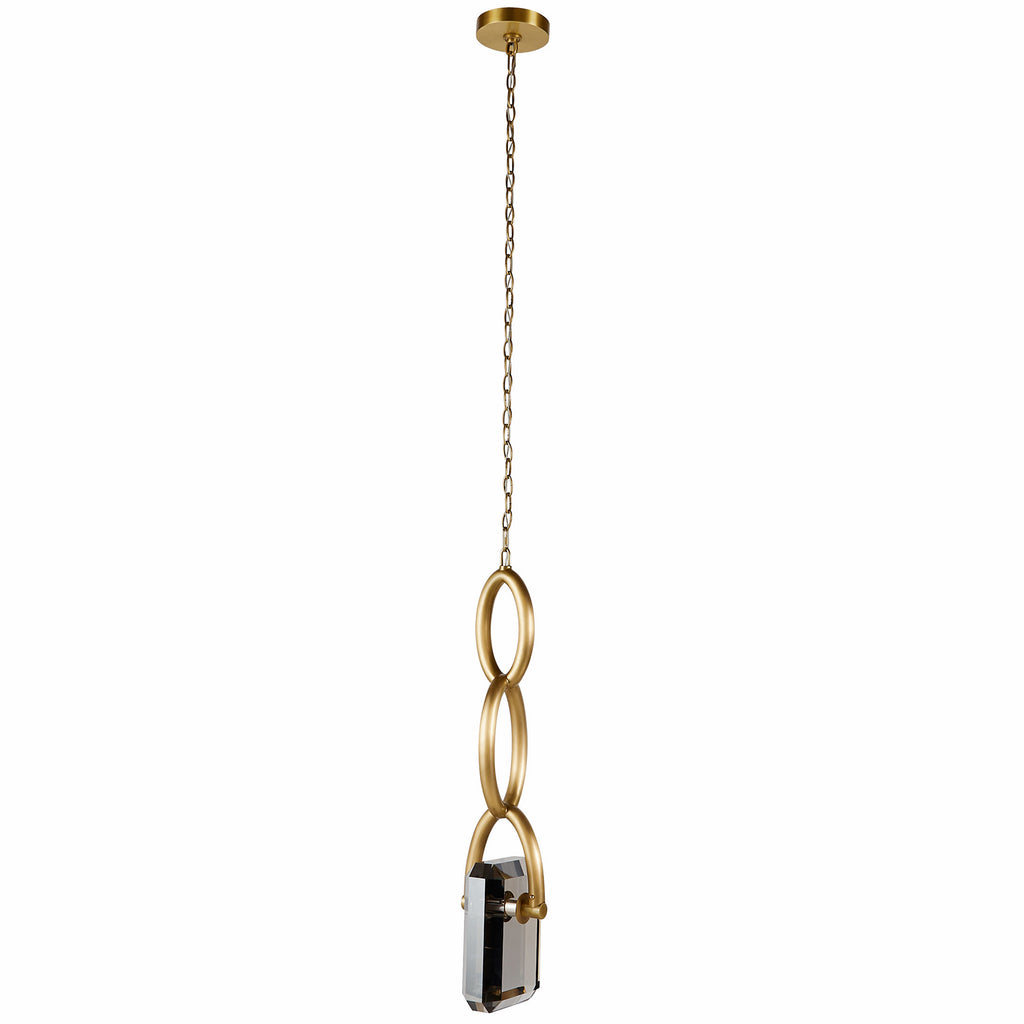 A thick chain of antique brass steel links together to form a stylish setting for our estate pendant. Designed to hold a faceted led-lit “gem” of smoke crystal, this impactful fixture is jewelry for the home.