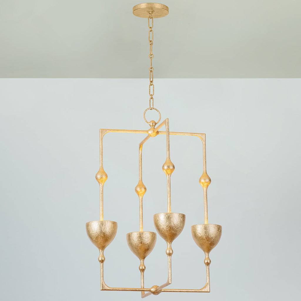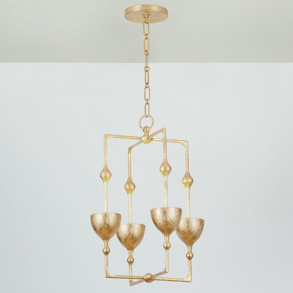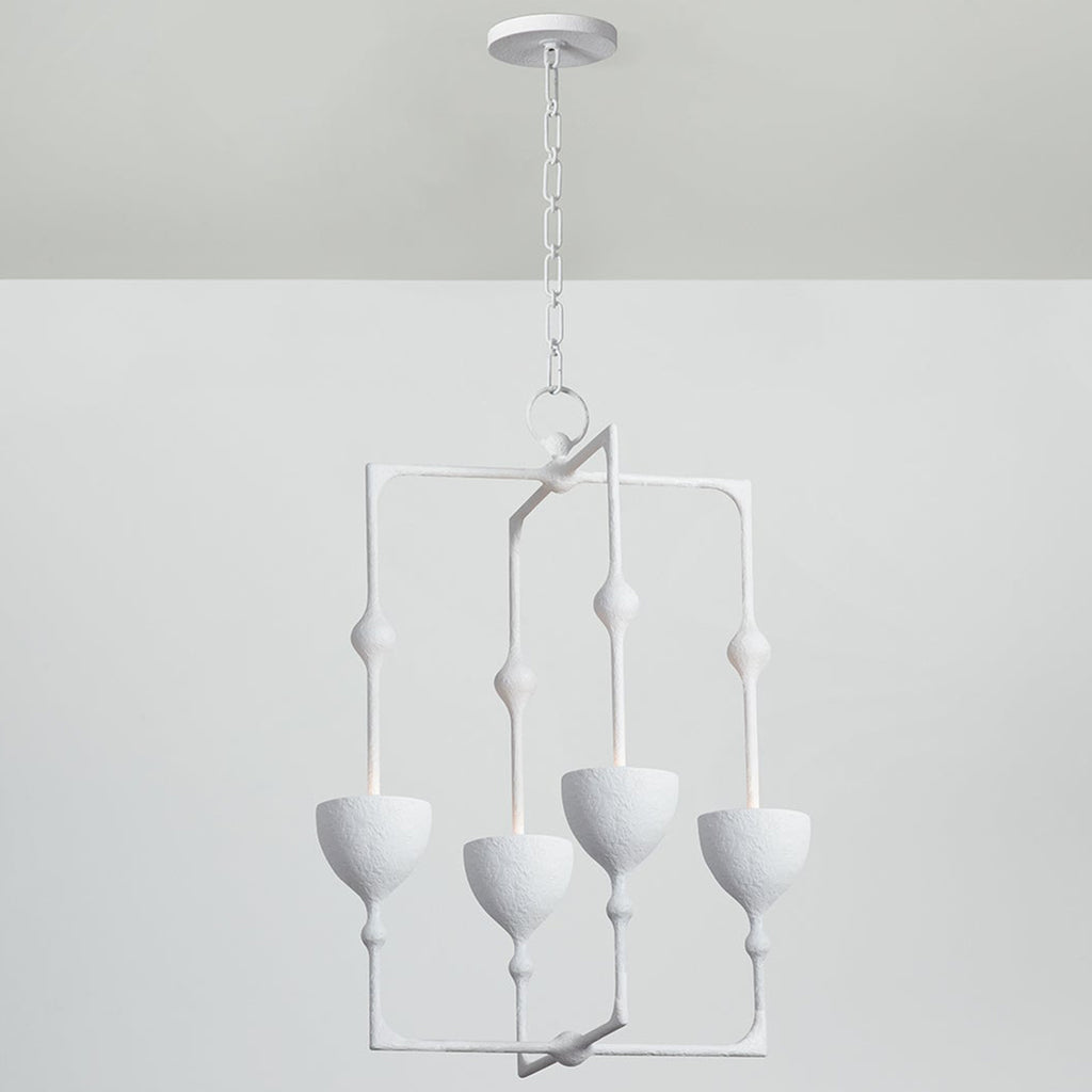 Drawing inspiration from the geometric patterns of Turkish tiles, this LED fixture merges high-concept design with otherworldly beauty. Long biomorphic stems support inverted bowl shades that direct light upwards. Available as a sconce or lantern in two sizes with the choice of a fresh Gesso White or luxurious Vintage Gold Leaf finish.