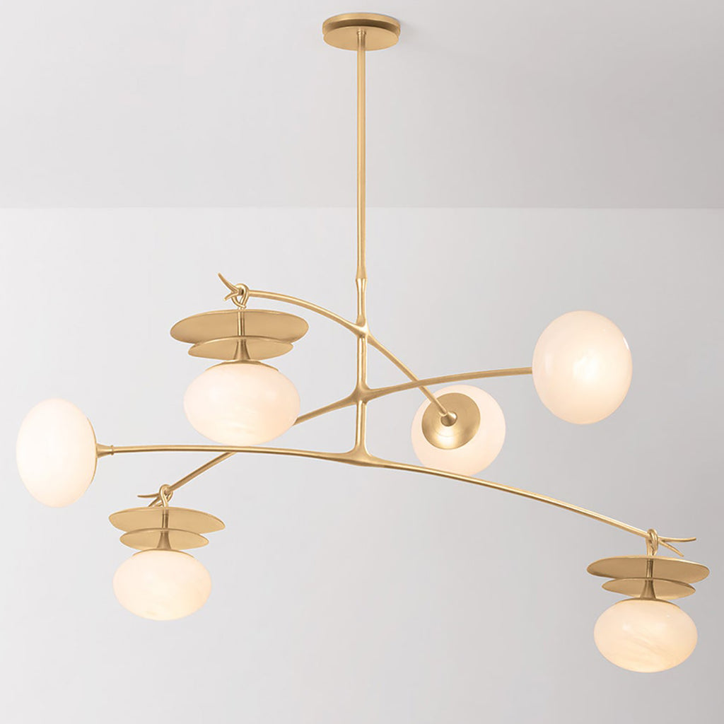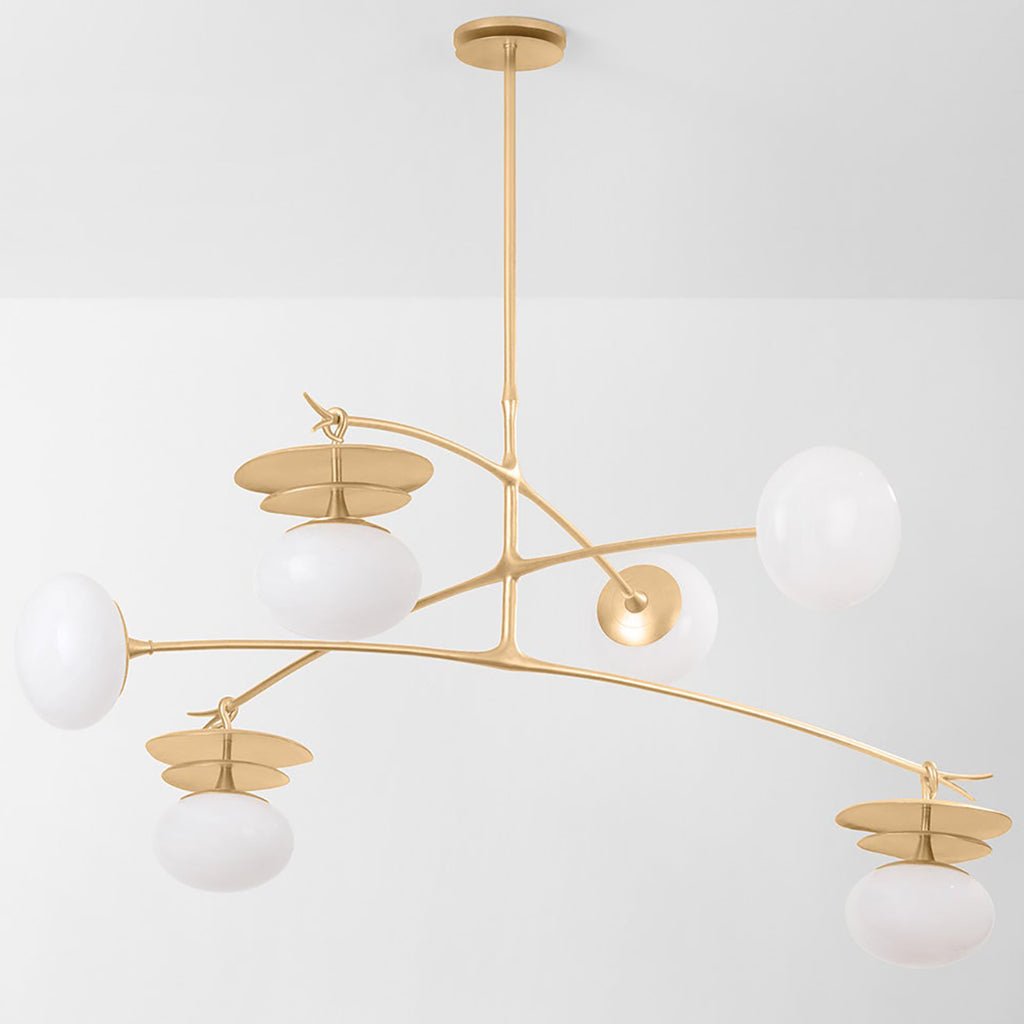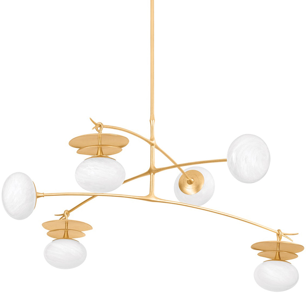 Inspired by botanical forms, this mobile chandelier balances organic shapes and delicate proportions to create a modern lighting fantasy. Stems of fluid metalwork support slender leaf-like disks. Resembling flowers in bloom, cloud glass spheres dangle gracefully from the Vintage Gold Leaf framework. Available as a 1-light sconce or 6-light pendant, Corbett Lighting Ceylon serves as a poetic representation of nature.