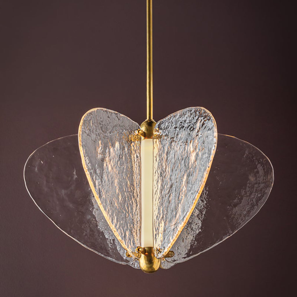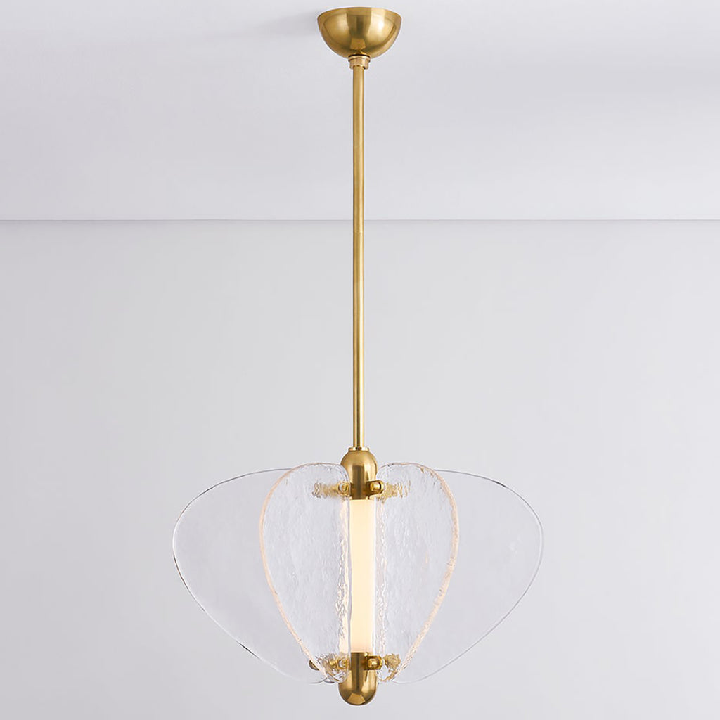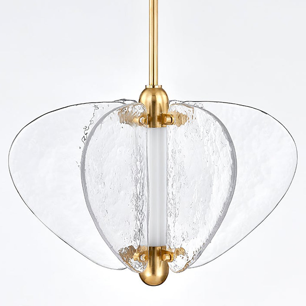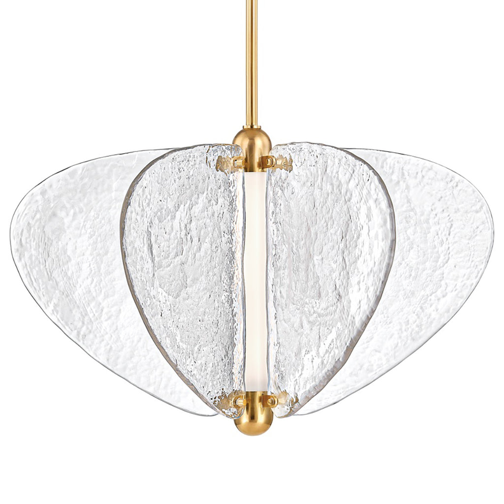 A frosty chill meets the warmth of LED in this sculptural pendant light. Resembling sheets of ice, four thin Piastra glass blades with chill marks extend from a central opal glossy glass core. A Vintage Brass framework provides a golden glow that enhances this pendants sparkle when lit.