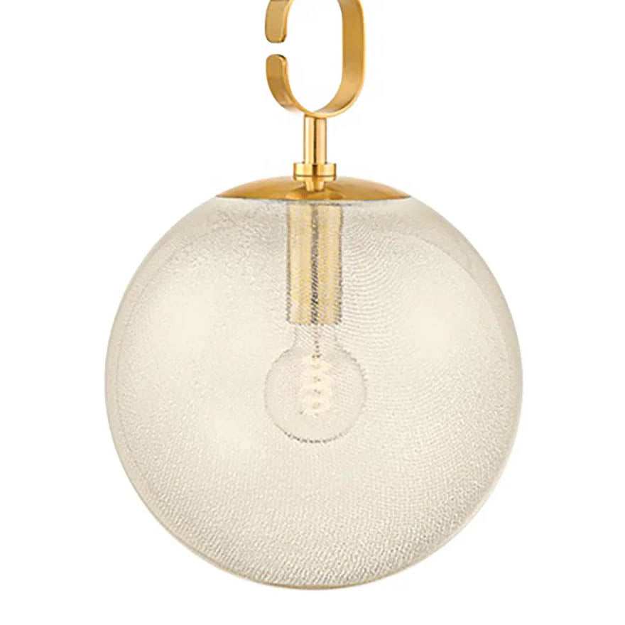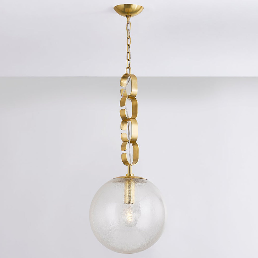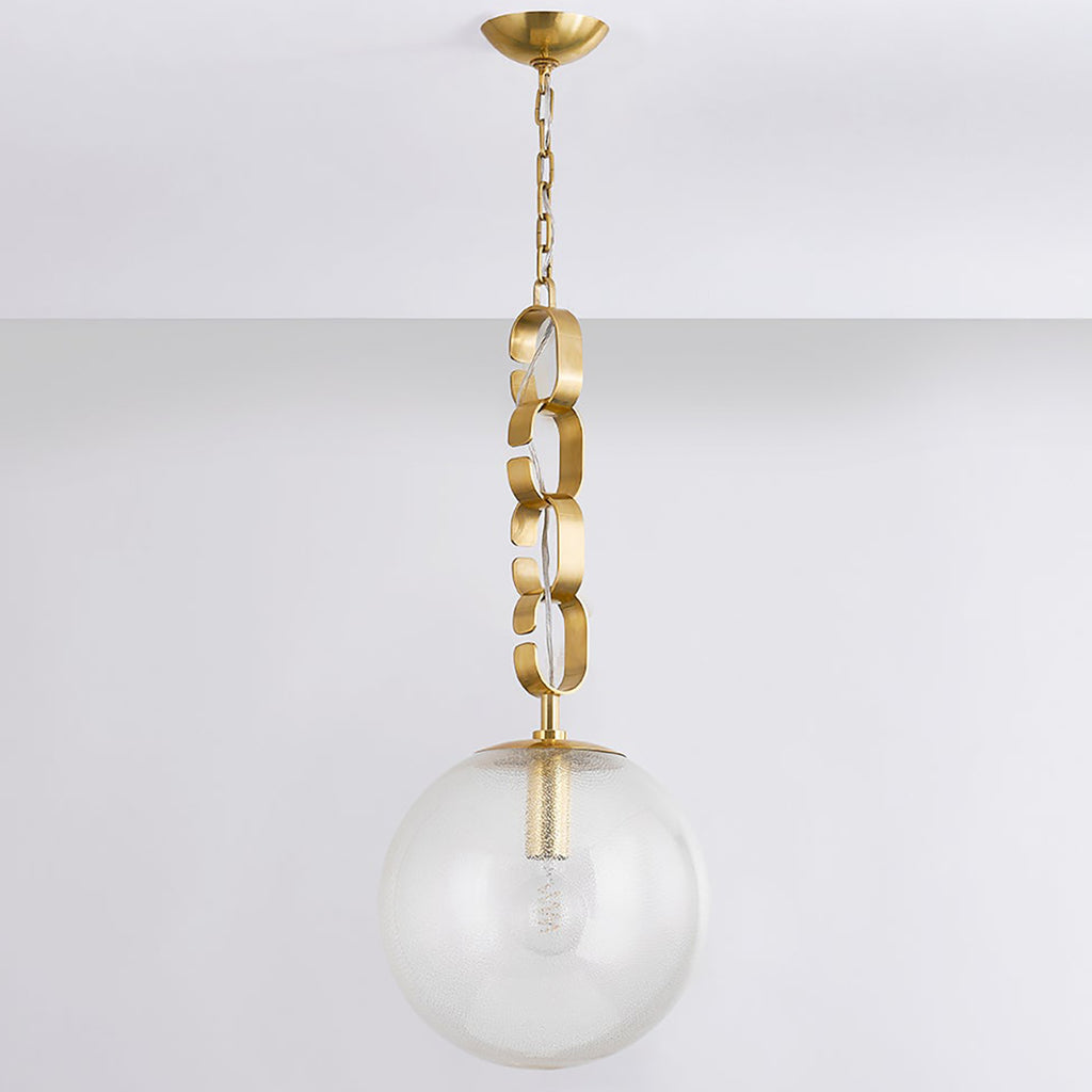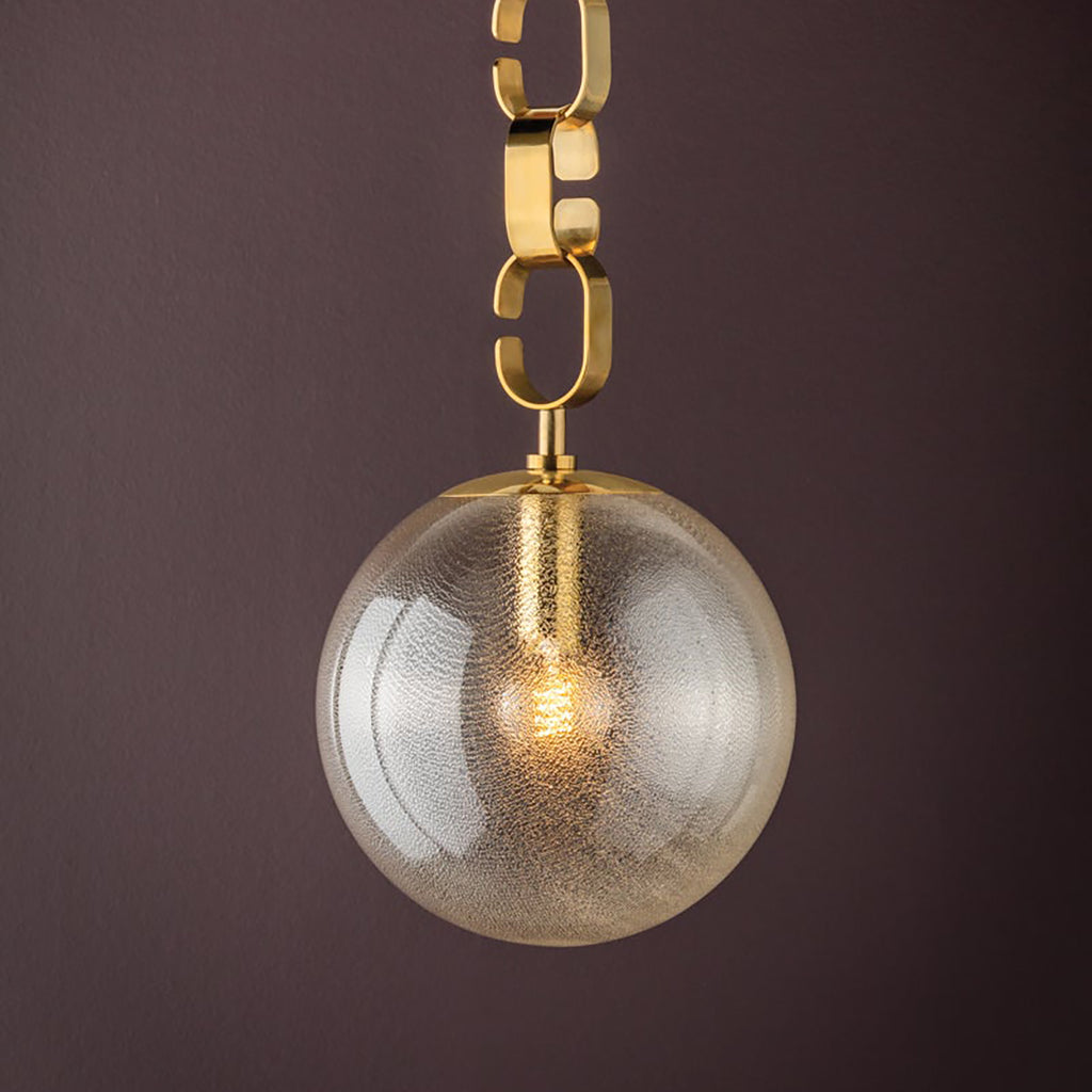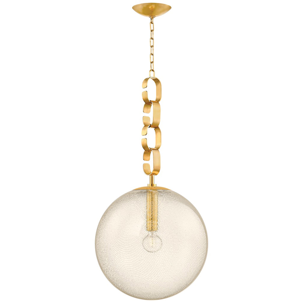Drawing inspiration from the opulence of the 1930s, this fixture is comprised of seeded glass orbs suspended by chunky Vintage Brass chains. The uniquely colored and swirled glass, coupled with the vintage-inspired forms creates a stunning fixture with high decorative flair. Corbett Lighting Nessa glimmers with warmth, whether as a chandelier or a pendant light in two sizes.