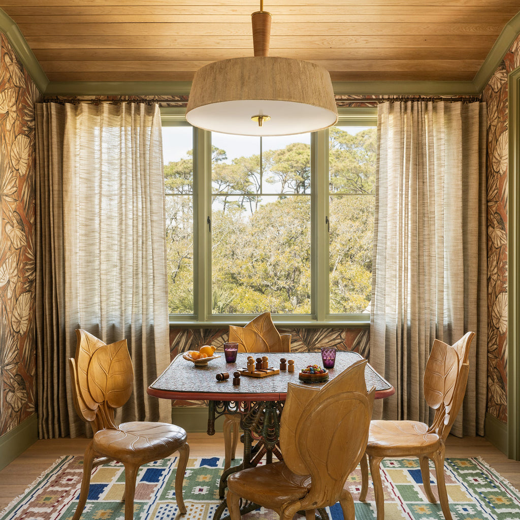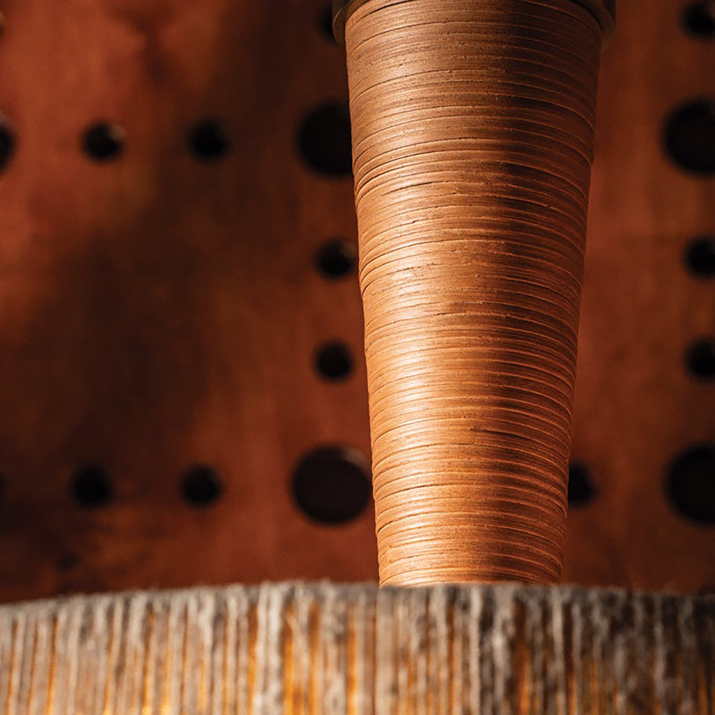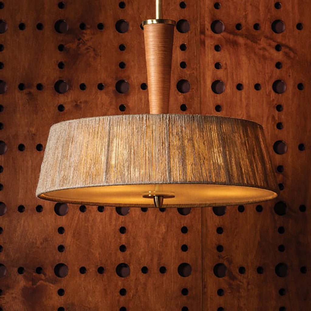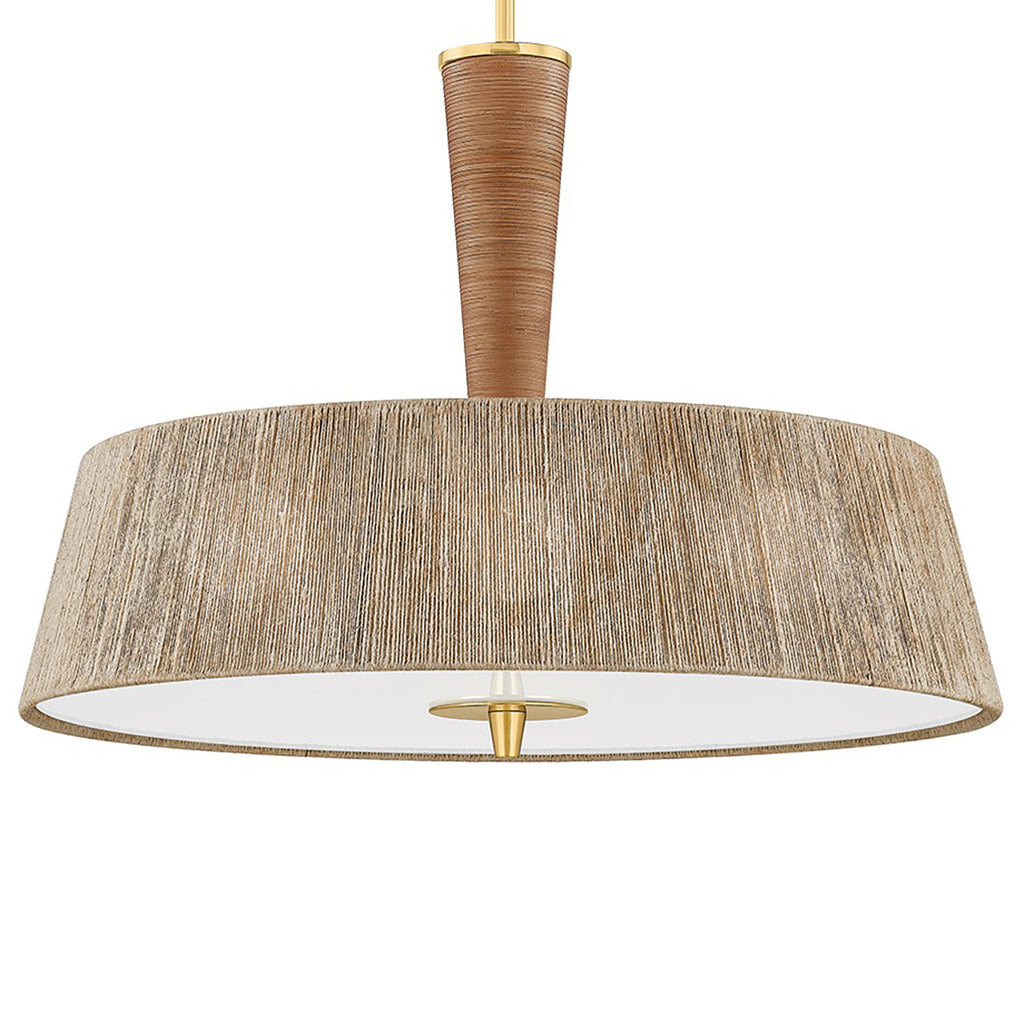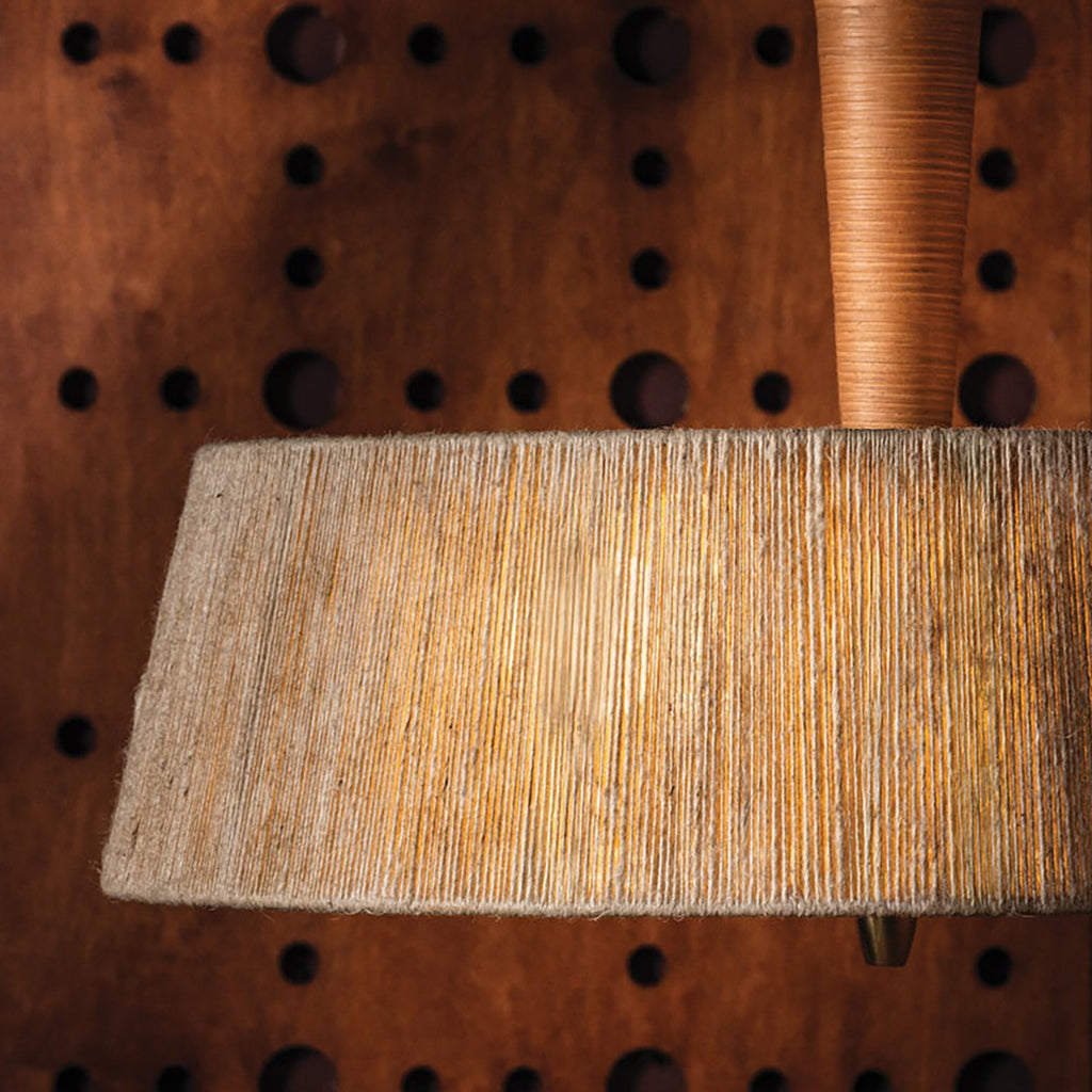 The Cortney Bishop x Hudson Valley Lighting George family of ceiling lights are boldly scaled and texturally inviting. The combination of the banana leaf string shade, rattan wrapping, and white glass gives each fixture a bohemian feel while remaining sophisticated. The natural, tonal hues enhance the rustic effect, while the Aged Brass metalwork is a timeless finish. Suitable for larger spaces, George introduces an organic freshness to entries and dining areas.