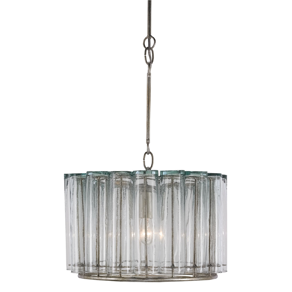The Bevilacqua Pendant is a magnificent toast to good taste. Filled with luminosity and grace, its reflective glass flutes are made from recycled bud vases. Its wrought iron frame is finished in an exquisite silver leaf that compliments the hues in the glass. This one-light pendant is one in a variety of fixtures in the Bevilacqua collection.
