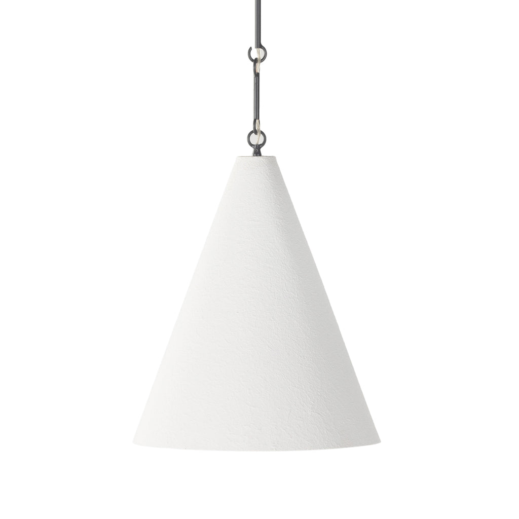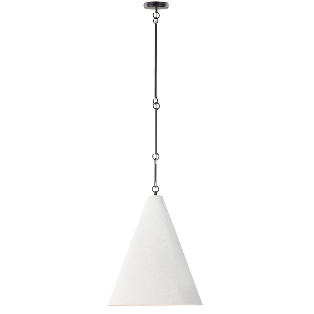 Simple and modern, this textured grand-scale pendant has a hand-molded look. Cast aluminum in a crisp matte white plaster finish is complemented with antiqued iron hardware and a jewelry-inspired chain.