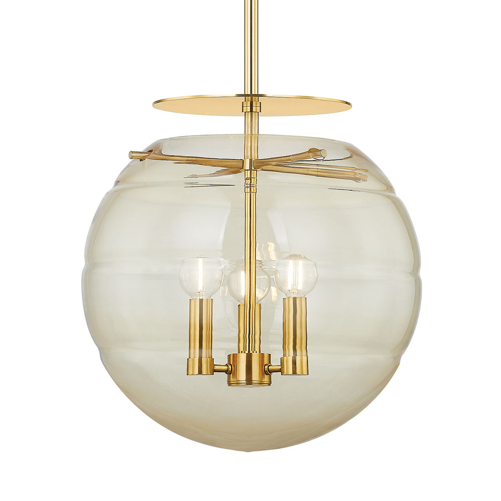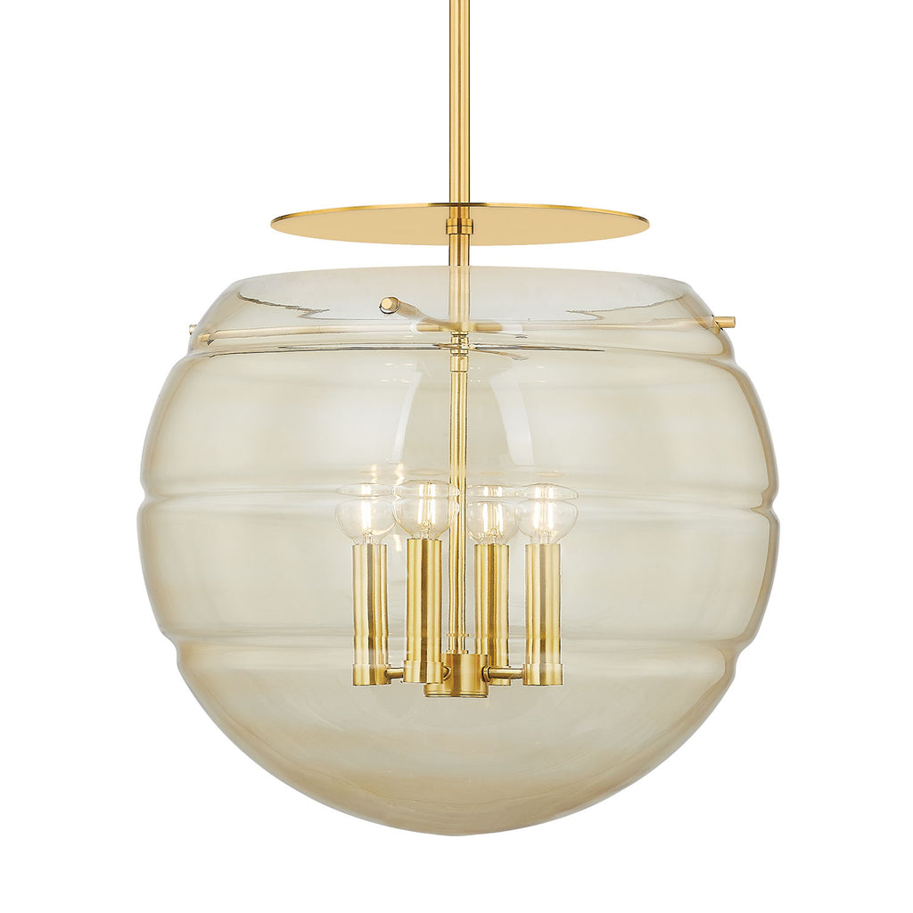 Renowned for built-to-last quality with a timeless feel, Hudson Valley offers a modern lighting collection with elegant touches, recalling vintage inspiration. Modern meets rustic in this nautical-inspired flush mount. A classic lantern receives a contemporary update in the form of Gill. The central candle cluster and Aged Brass framework feel historical, while the bubble-like shade points toward the future. A champagne swirl glass technique has been applied to the sphere, adding to the dynamic energy of this pendant. Gill is available with 3 or 4 lights.