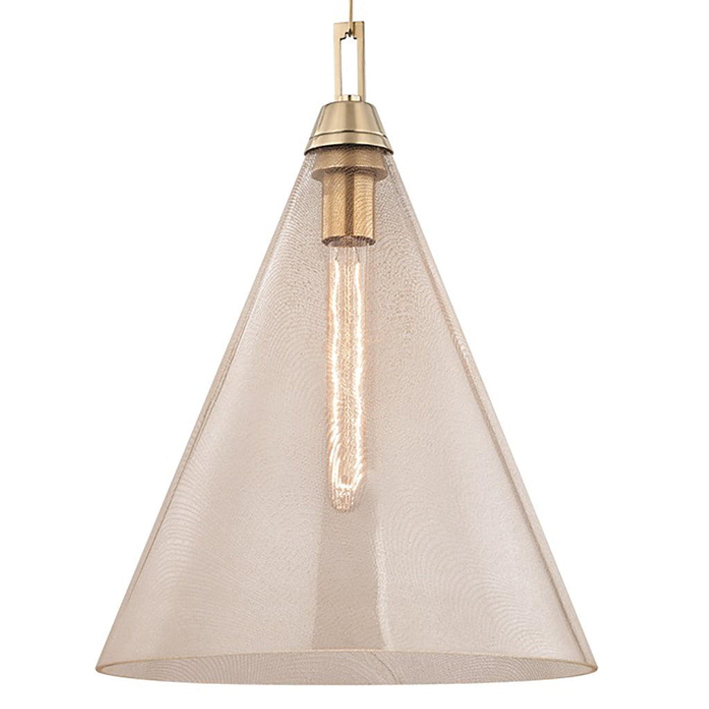 This stunning piece is a minimalist work of art; using a unique European technique, artisans inlay strands of brass to the molten glass while blowing it into a cone. This brass remains encapsulated there, coming to life when illuminated from within and resulting in a work of simple sophistication. Housing a long, tungsten-filament bulb, each piece gives forth its own character.